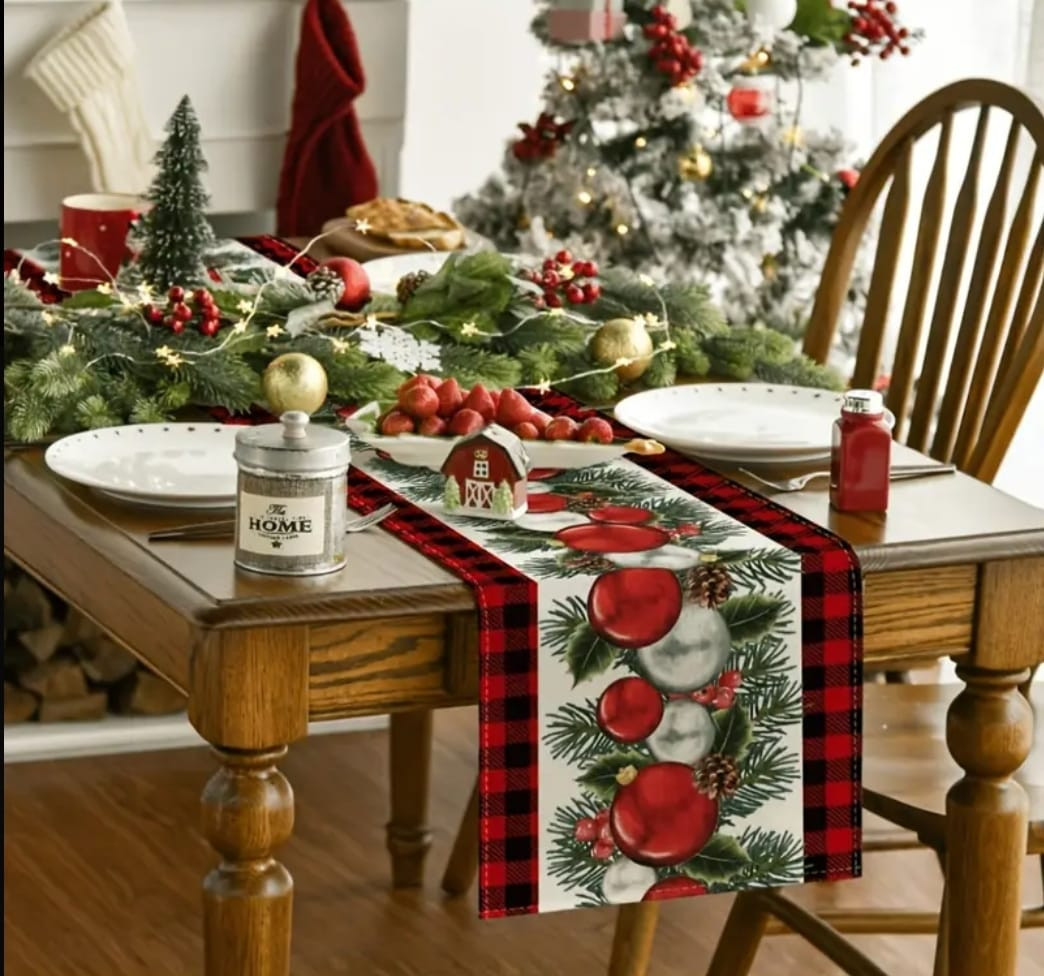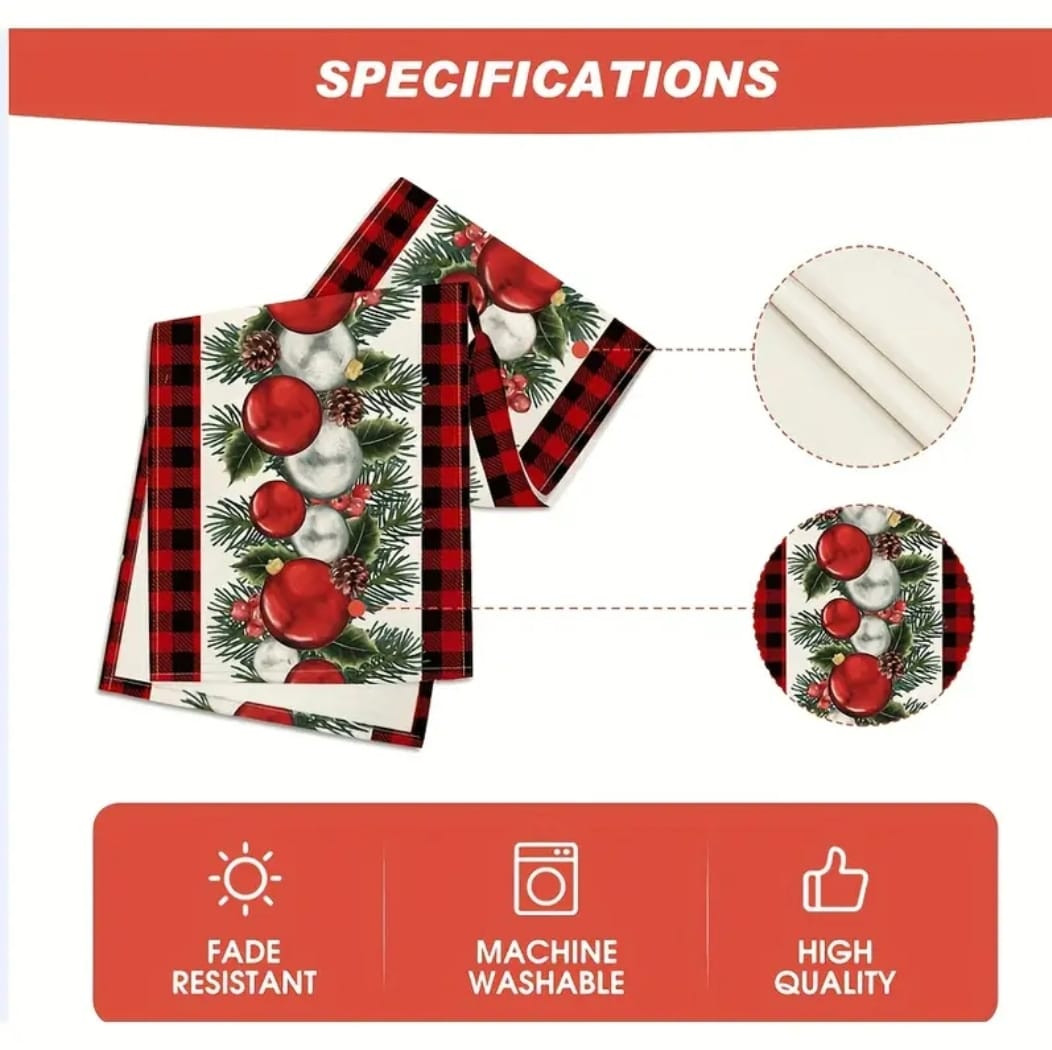 Добавьте волшебства и уюта вашему праздничному столу с этой стильной новогодней дорожкой! Декор выполнен в традиционных рождественских тонах — красный, белый и зелёный — и украшен принтом с елочными шарами, сосновыми ветками и шишками. Клетчатая кайма придаёт дизайну уютный деревенский шарм.