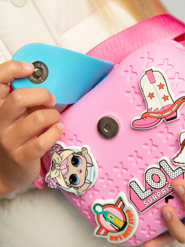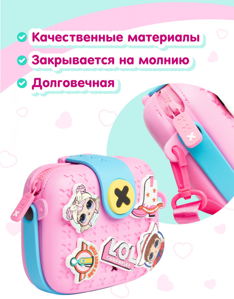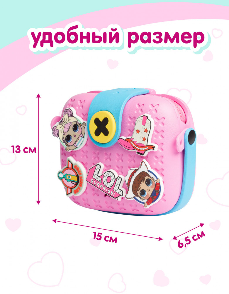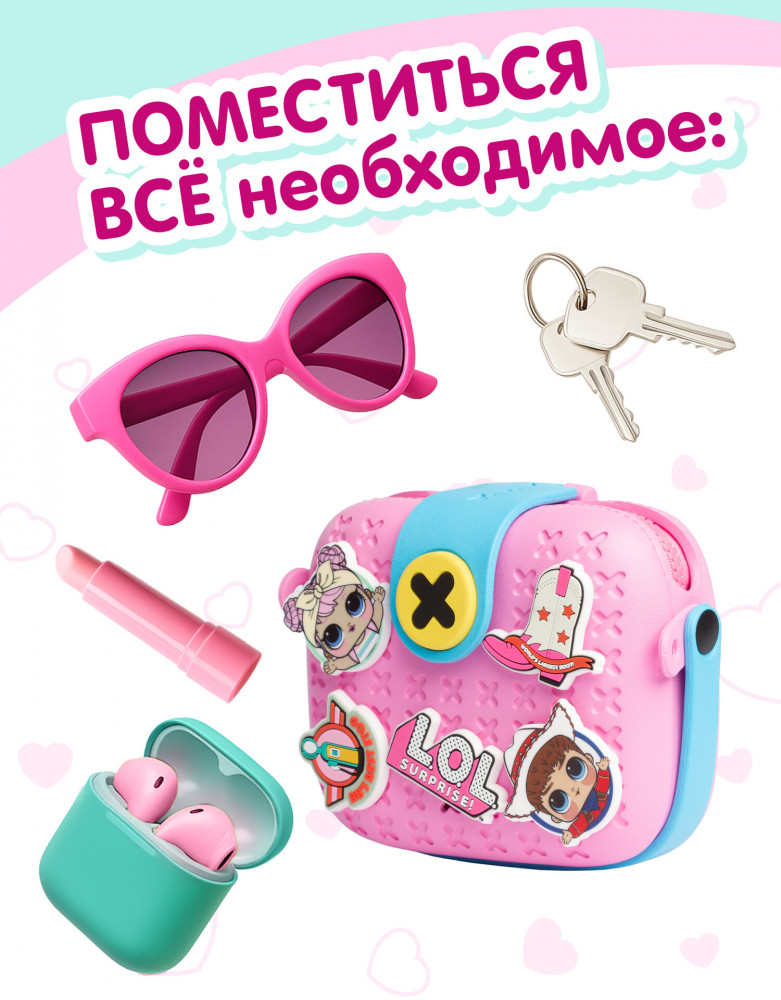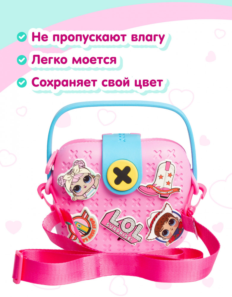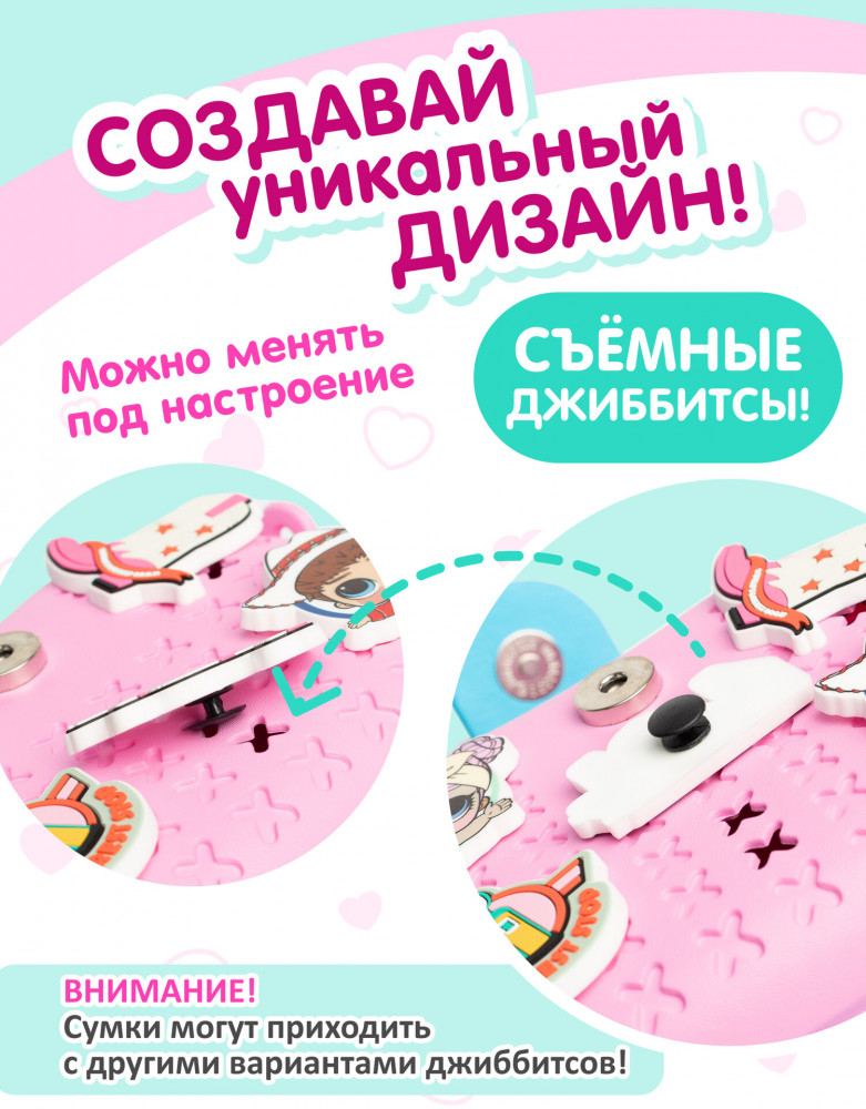 Яркая розовая сумка на застёжке с дизайном по мотивам популярного бренда L.O.L. Surprise! Её оригинальный внешний вид со съёмными элементами, ремешком и милой застёжкой оценит каждая юная модница! Аксессуары-джиббитсы можно легко менять, создавая уникальный образ хоть каждый день. Сумочка достаточно вместительна для хранения монеток, карточек и других мелочей. Сумка прекрасно держит форму, что обеспечивает его долговечность и сохранение аккуратного вида даже при самом активном использовании. Изделие легко очищается от загрязнений, благодаря прорезиненному материалу. Сумочка станет отличным подарком для каждой маленькой поклонницы L.O.L. Surprise! Это не просто дополнение к образу, а настоящая находка для творческих личностей, которые любят экспериментировать с модой. Подарите своему ребенку возможность выделяться среди других! В комплект входит 5 джиббитсов. Аксессуар подойдёт как для повседневных прогулок, так и для особых случаев — он отлично дополняет наряд в день рождения или праздники. Позвольте вашему ребенку создать свой уникальный стиль. Регулируемый ремешок обеспечивает комфорт при ношении, а компактные размеры делают сумочку подходящей даже для самых маленьких модниц. Застёжка надёжно сохранит содержимое сумочки. Стильный и практичный выбор на каждый день!