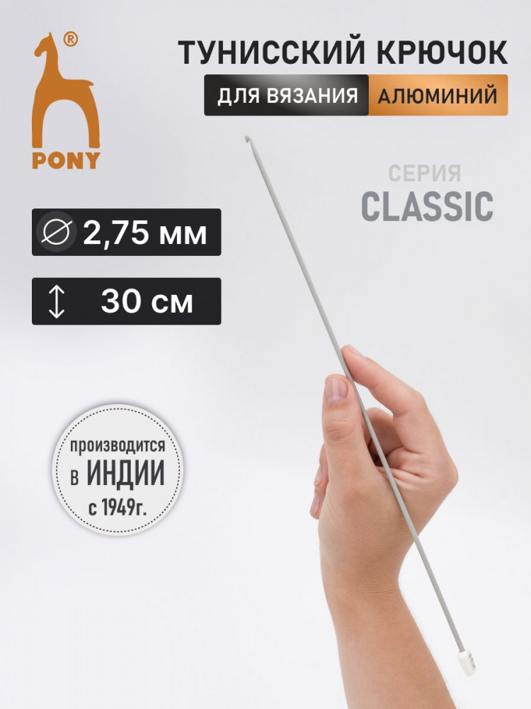 Удлиненный крючок от Pony создан специально для тунисского вязания. Его можно использовать аналогично стандартным крючкам, однако он имеет существенные отличия, приближаясь по функциональности к спицам. Главное отличие- увеличенная длина, необходимая для удержания петель непосредственно на крючке в процессе тунисского вязания. Изготовленный из алюминия, этот крючок отличается повышенной износостойкостью. Благодаря электролитическому оксидированию, поверхность инструмента приобретает идеальную гладкость, что обеспечивает комфортное скольжение нити и облегчает процесс вязания. Кроме того, данная обработка придает крючку дополнительную прочность, гибкость и надежную защиту от коррозии. Удобный пластиковый наконечник препятствует роспуску набранных петель, что позволит вязать с абсолютным комфортом.