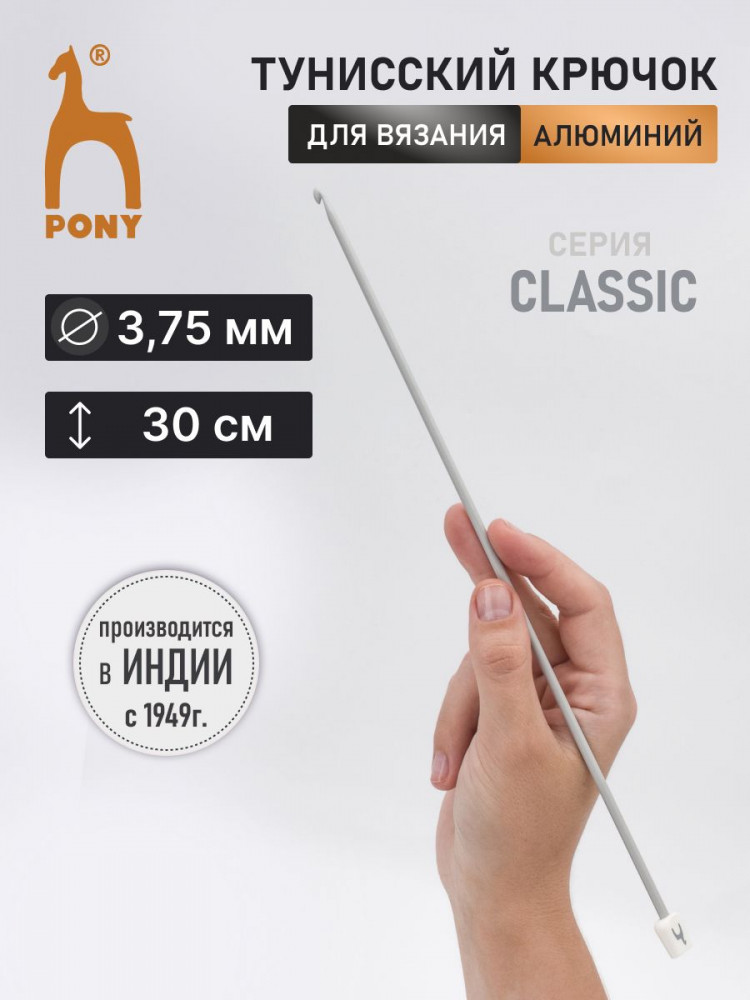 Удлиненный крючок от Pony создан специально для тунисского вязания. Его можно использовать аналогично стандартным крючкам, однако он имеет существенные отличия, приближаясь по функциональности к спицам. Главное отличие- увеличенная длина, необходимая для удержания петель непосредственно на крючке в процессе тунисского вязания. Изготовленный из алюминия, этот крючок отличается повышенной износостойкостью. Благодаря электролитическому оксидированию, поверхность инструмента приобретает идеальную гладкость, что обеспечивает комфортное скольжение нити и облегчает процесс вязания. Кроме того, данная обработка придает крючку дополнительную прочность, гибкость и надежную защиту от коррозии. Удобный пластиковый наконечник препятствует роспуску набранных петель, что позволит вязать с абсолютным комфортом.