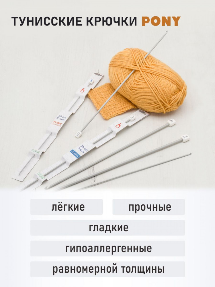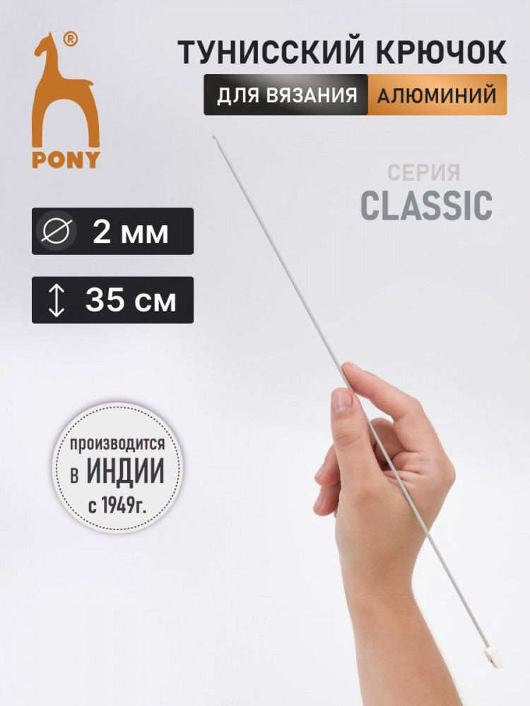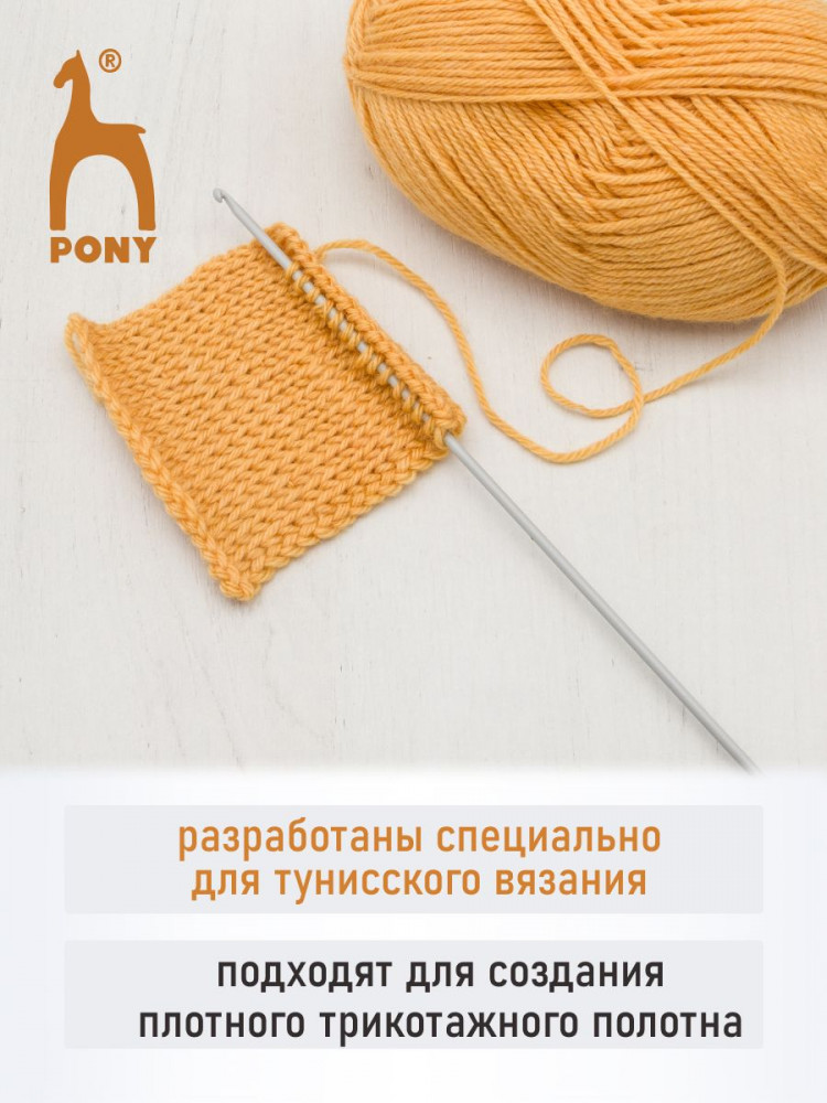 Удлиненный крючок от Pony создан специально для тунисского вязания. Его можно использовать аналогично стандартным крючкам, однако он имеет существенные отличия, приближаясь по функциональности к спицам. Главное отличие- увеличенная длина, необходимая для удержания петель непосредственно на крючке в процессе тунисского вязания. Изготовленный из алюминия, этот крючок отличается повышенной износостойкостью. Благодаря электролитическому оксидированию, поверхность инструмента приобретает идеальную гладкость, что обеспечивает комфортное скольжение нити и облегчает процесс вязания. Кроме того, данная обработка придает крючку дополнительную прочность, гибкость и надежную защиту от коррозии. Удобный пластиковый наконечник препятствует роспуску набранных петель, что позволит вязать с абсолютным комфортом.