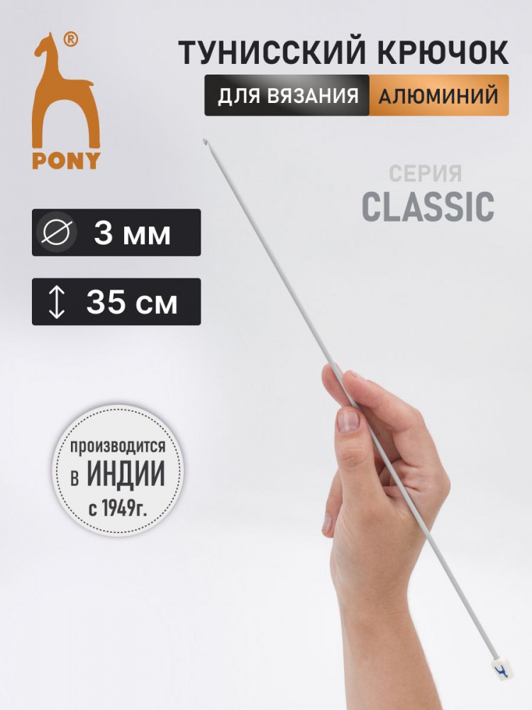 Удлиненный крючок от Pony создан специально для тунисского вязания. Его можно использовать аналогично стандартным крючкам, однако он имеет существенные отличия, приближаясь по функциональности к спицам. Главное отличие- увеличенная длина, необходимая для удержания петель непосредственно на крючке в процессе тунисского вязания. Изготовленный из алюминия, этот крючок отличается повышенной износостойкостью. Благодаря электролитическому оксидированию, поверхность инструмента приобретает идеальную гладкость, что обеспечивает комфортное скольжение нити и облегчает процесс вязания. Кроме того, данная обработка придает крючку дополнительную прочность, гибкость и надежную защиту от коррозии. Удобный пластиковый наконечник препятствует роспуску набранных петель, что позволит вязать с абсолютным комфортом.