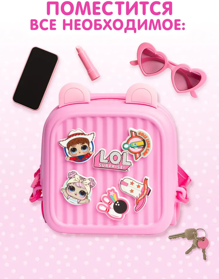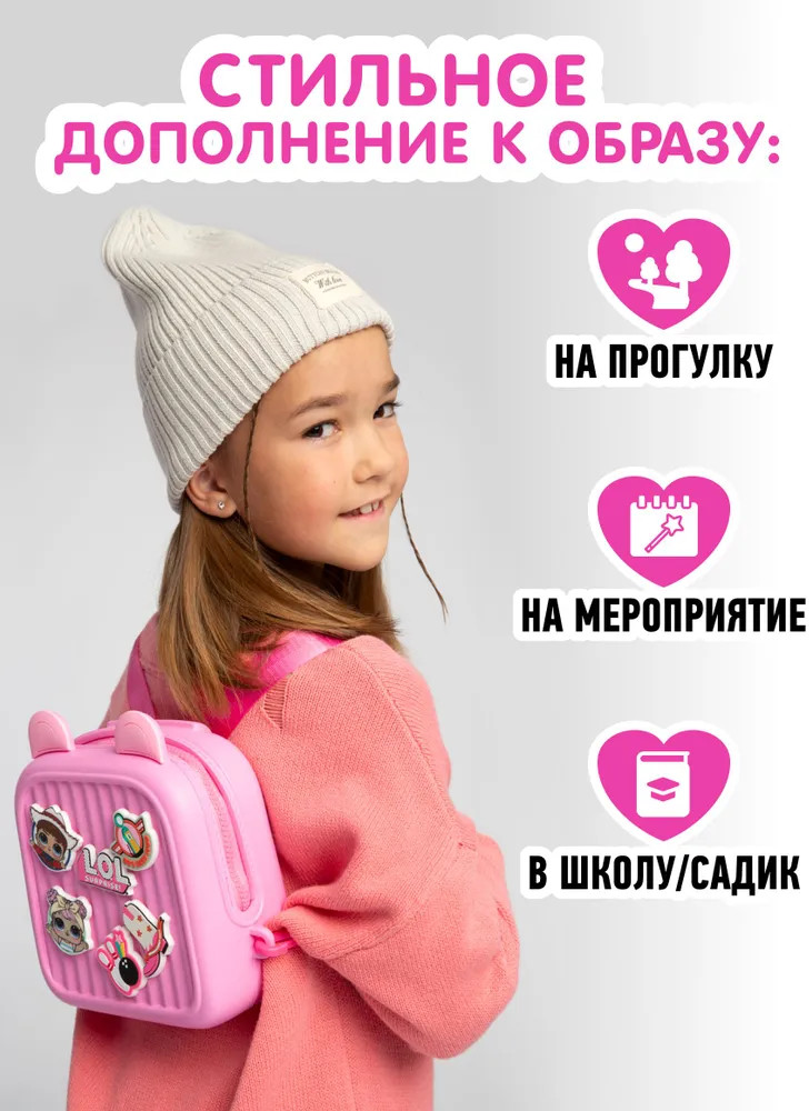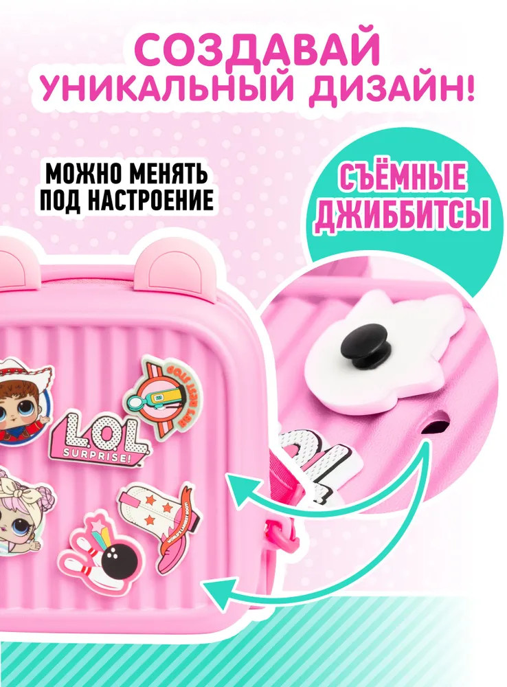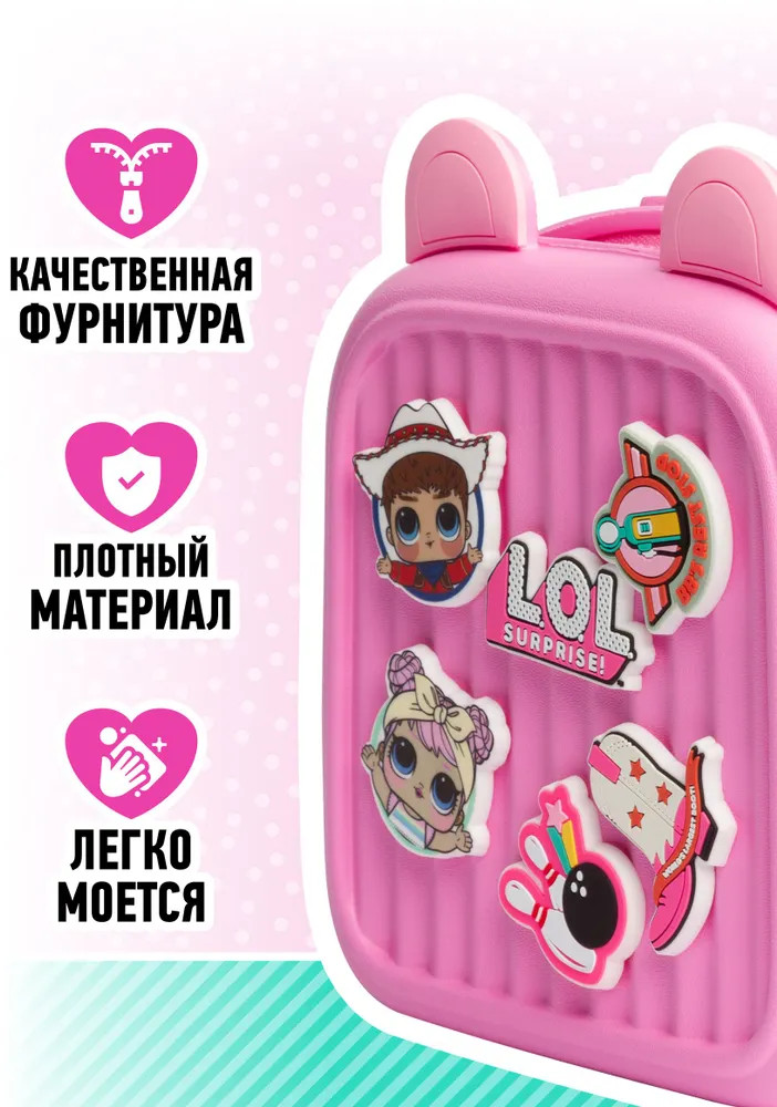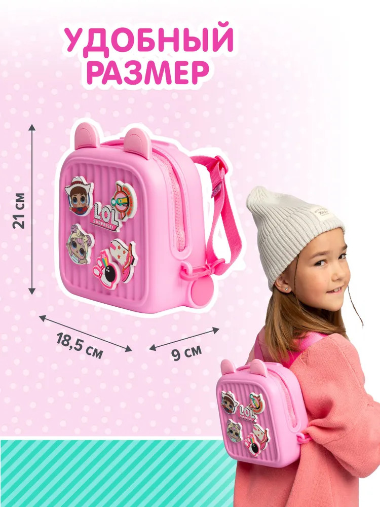 Яркий розовый рюкзак с дизайном по мотивам популярного бренда L.O.L. Surprise! станет стильным аксессуаром для девочек. Его оригинальный внешний вид с ушками и съёмными элементами оценит каждая юная модница! Аксессуары-джиббитсы можно легко менять, создавая уникальный образ хоть каждый день. Эта функциональная модель подойдёт для повседневного использования. Рюкзак прекрасно держит форму, что обеспечивает его долговечность и сохранение аккуратного вида даже при активном использовании. Лёгкость в уходе позволит быстро очищать аксессуар от загрязнений, сохраняя его ярким и привлекательным на протяжении длительного времени. Рюкзак достаточно вместителен для хранения телефона, карточек, блокнота и вещей. Рюкзак с милыми ушками станет отличным подарком для каждой маленькой поклонницы L.O.L. Surprise! Это не просто дополнение к образу, а настоящая находка для творческих личностей, которые любят экспериментировать с модой. Подарите своему ребёнку возможность выделяться среди других с помощью этого замечательного аксессуара! В комплект входит 6 джиббитсов. Рюкзак подойдёт как для повседневных прогулок, так и для особых случаев — он отлично дополняет наряд в день рождения или праздники. Позвольте вашему ребенку создать свой уникальный стиль! Этот рюкзак — не просто сумка для хранения вещей, а особенный акцент в образе юной модницы. Регулируемые ремешки обеспечивают комфорт при ношении, а компактные размеры делают его подходящим даже для самых маленьких модниц, рюкзак представлен в двух ярких цветах: бирюзовый и розовый — выберите тот, что понравится именно вам. Стильный и практичный выбор на каждый день!