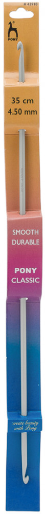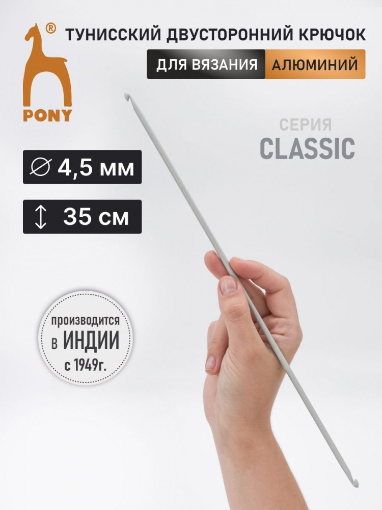 Удлиненный двусторонний крючок от Pony создан специально для тунисского вязания. Его можно использовать аналогично стандартным крючкам, однако он имеет существенные отличия, приближаясь по функциональности к спицам. Главное отличие- увеличенная длина, необходимая для удержания петель непосредственно на крючке в процессе тунисского вязания. Изготовленный из алюминия, этот крючок отличается повышенной износостойкостью. Благодаря электролитическому оксидированию, поверхность инструмента приобретает идеальную гладкость, что обеспечивает комфортное скольжение нити и облегчает процесс вязания. Кроме того, данная обработка придает крючку дополнительную прочность, гибкость и надежную защиту от коррозии.