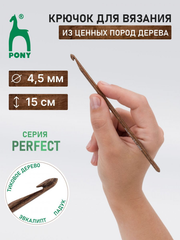 Крючок для вязания Perfect от Pony — инструмент, специально разработанный для работы с тонкой пряжей и для создания салфеток, шалей, кардиганов и других ажурных вещей. Для изготовления крючка используется древесина трех редких пород дерева: эвкалипта, падука и тика. Заготовка сырья ведется в лесах, где посадки деревьев возобновляются, позволяя избежать ущерба для природы. Тщательно отшлифованный крючок обладает гладкой, шелковистой поверхностью. Он не повреждает структуру нити и приятен на ощупь во время вязания. Каждый крючок имеет уникальный древесный рисунок.