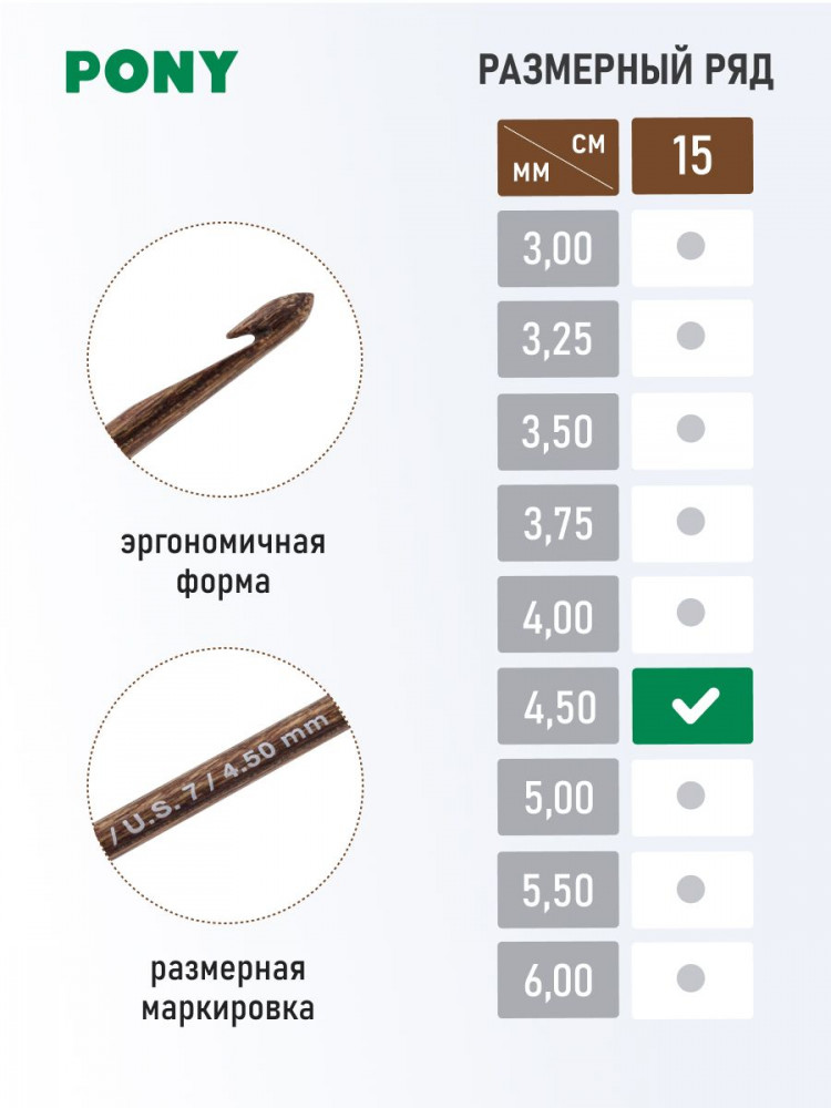 Крючок имеет безопасную закругленную рабочую область, поэтому им могут пользоваться даже школьники, конечно же, находясь под наблюдением взрослых. Такая особенность значительно расширяет возможности применения крючка, делая его доступным для начинающих мастеров любого возраста. Каждый крючок Pony снабжен маркировкой с указанием размера, позволяя легко выбирать нужный инструмент для конкретного проекта. С помощью крючка можно связать эксклюзивный подарок-сувенир, подарить новую жизнь любимым вещам, обновив их красивым ажурным декором, или пополнить свой гардероб стильной и оригинальной обновкой.