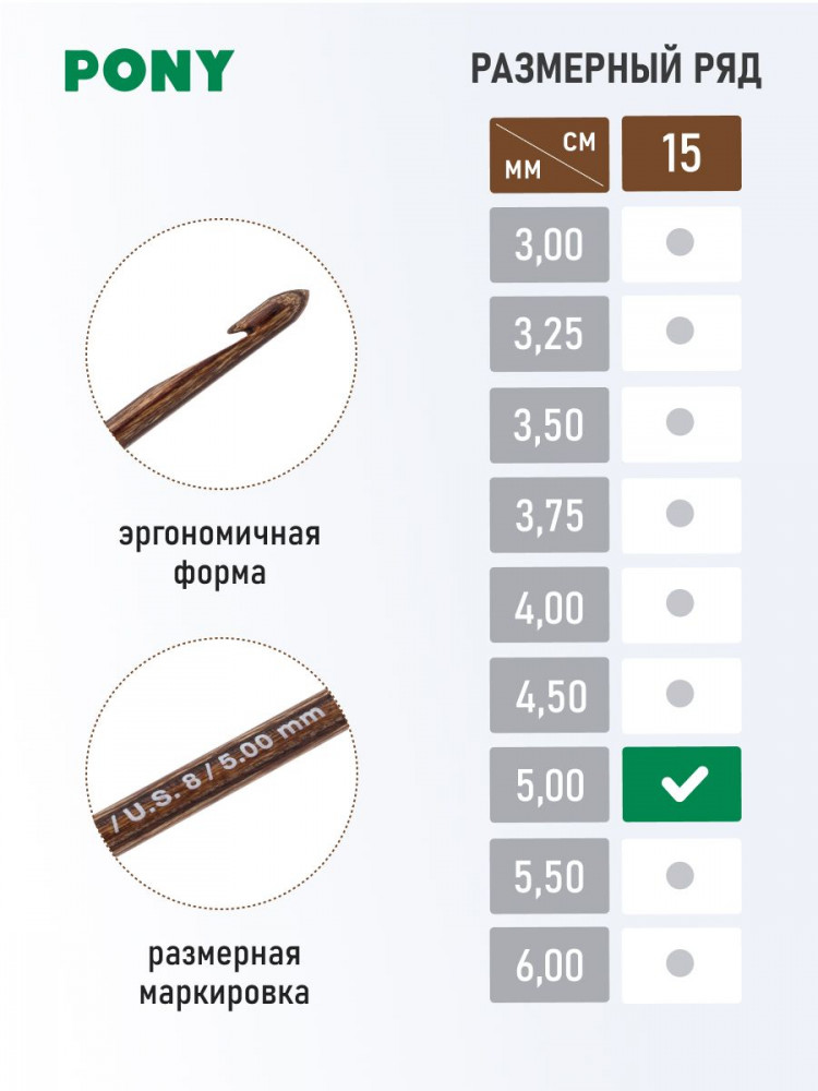 Крючок имеет безопасную закругленную рабочую область, поэтому им могут пользоваться даже школьники, конечно же, находясь под наблюдением взрослых. Такая особенность значительно расширяет возможности применения крючка, делая его доступным для начинающих мастеров любого возраста. Каждый крючок Pony снабжен маркировкой с указанием размера, позволяя легко выбирать нужный инструмент для конкретного проекта. С помощью крючка можно связать эксклюзивный подарок-сувенир, подарить новую жизнь любимым вещам, обновив их красивым ажурным декором, или пополнить свой гардероб стильной и оригинальной обновкой.