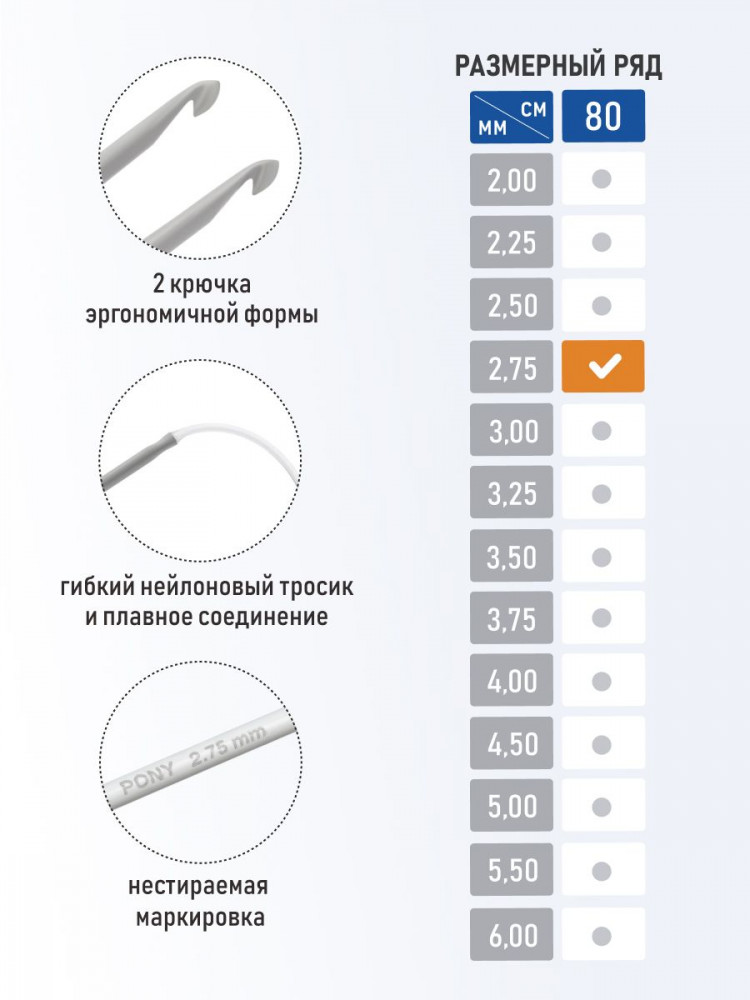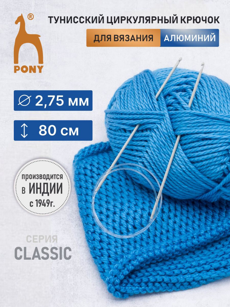 Крючки для вязания с тросиком от Pony порадуют рукодельниц своим качеством, оригинальным дизайном и удобством в применении. Крючки ориентированы на удобство при работе в тунисской (афганской) технике вязания. Два алюминиевых крючка с аккуратными головками классической формы объединены между собой гибким нейлоновым тросиком, как круговые спицы. Такая конструкция облегчает вывязывание объемных полотен с плотным узором и позволяет сократить расход пряжи. Идеально подходит для вязания различных бесшовных деталей одежды, а также носков или головных уборов.