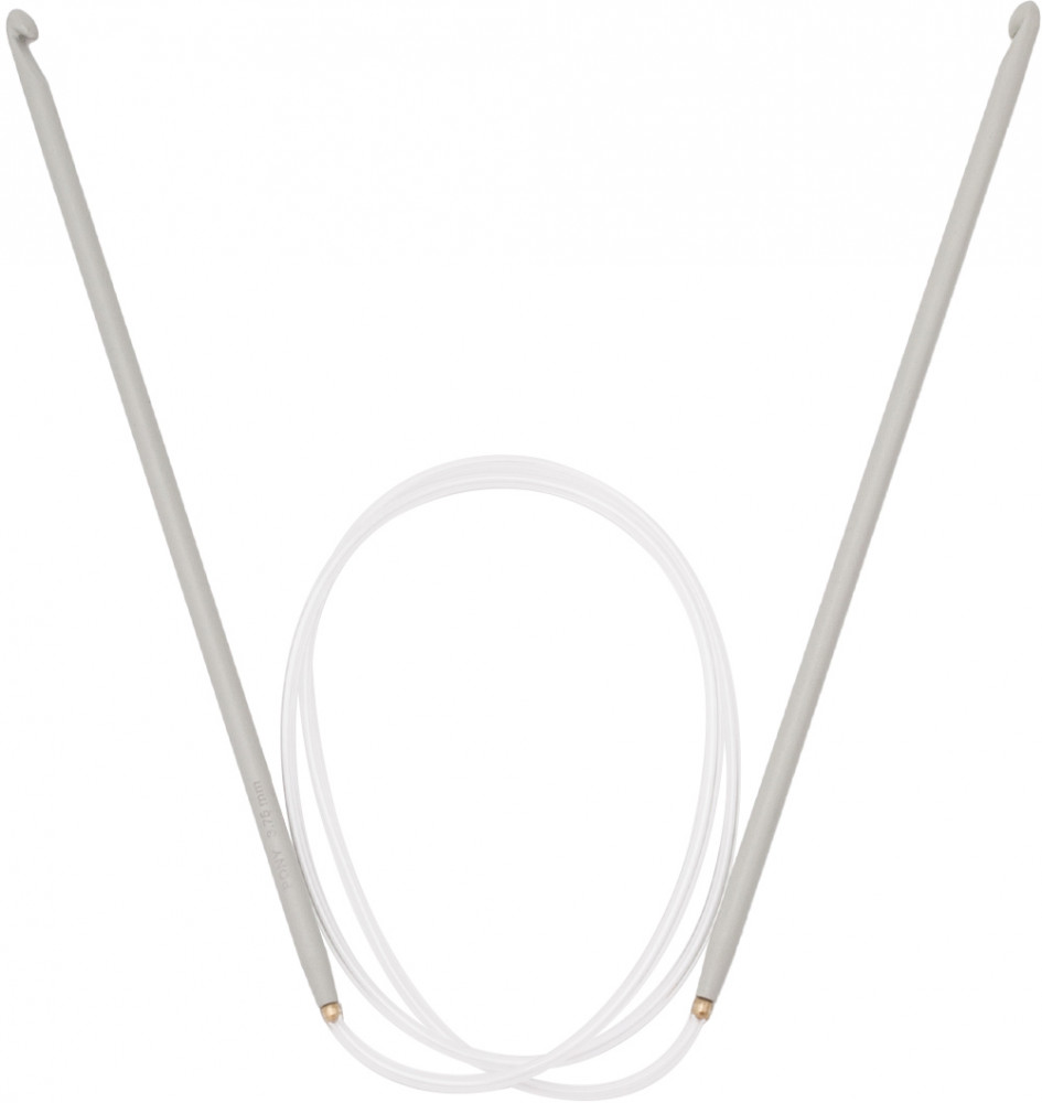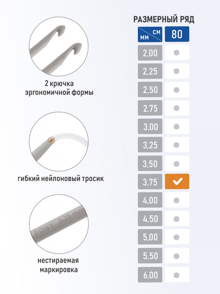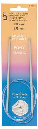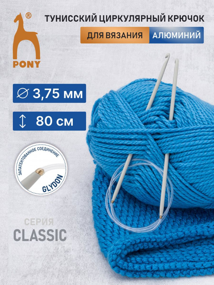 Крючки для вязания с тросиком от Pony порадуют рукодельниц своим качеством, оригинальным дизайном и удобством в применении. Крючки ориентированы на удобство при работе в тунисской (афганской) технике вязания. Два алюминиевых крючка с аккуратными головками классической формы объединены между собой гибким нейлоновым тросиком, как круговые спицы. Такая конструкция облегчает вывязывание объемных полотен с плотным узором и позволяет сократить расход пряжи. Идеально подходит для вязания различных бесшовных деталей одежды, а также носков или головных уборов.