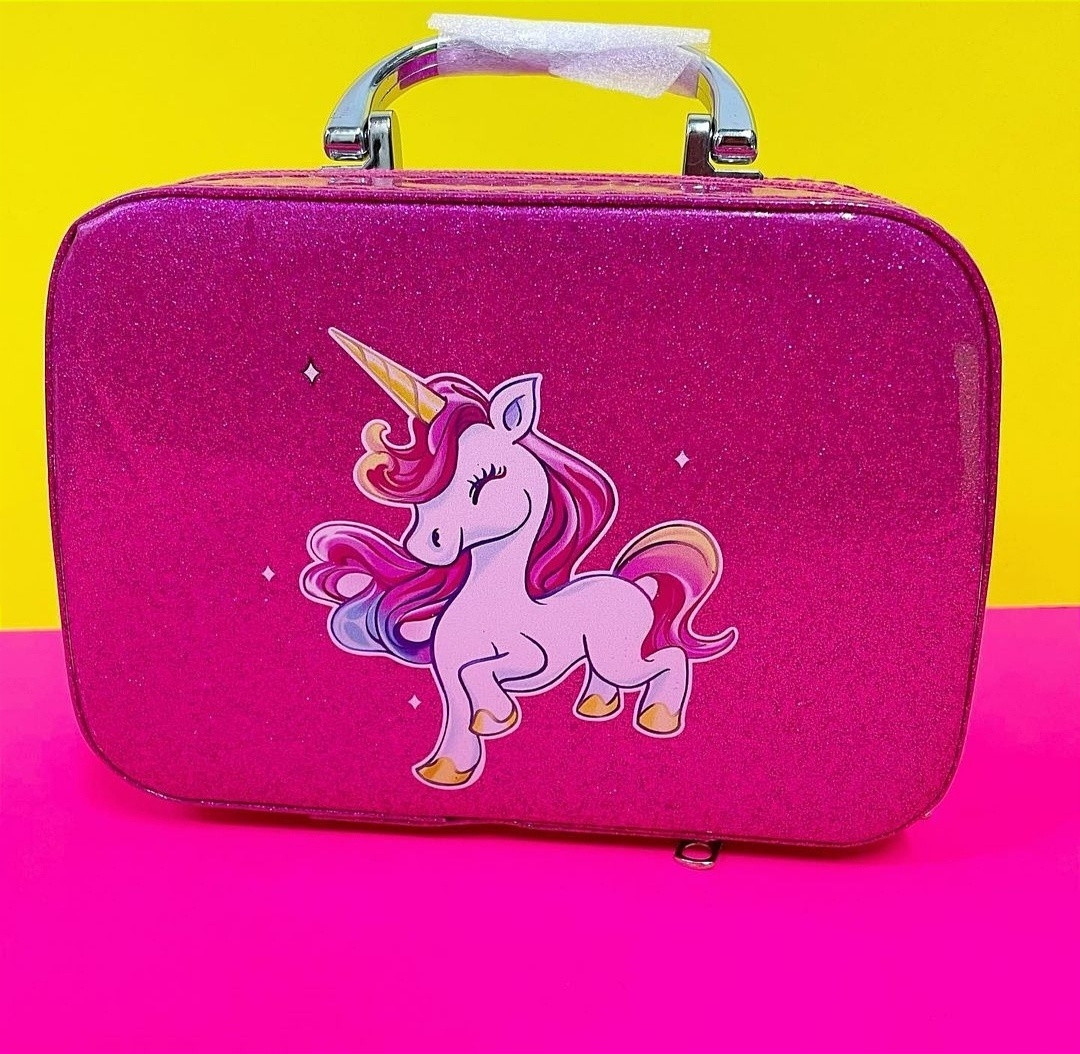 Внутри находятся различные косметические средства: тени для век, румяна, блеск для губ, а также кисточки для макияжа. Фон изображения выполнен в ярких цветах, что делает набор более заметным и привлекательным. |