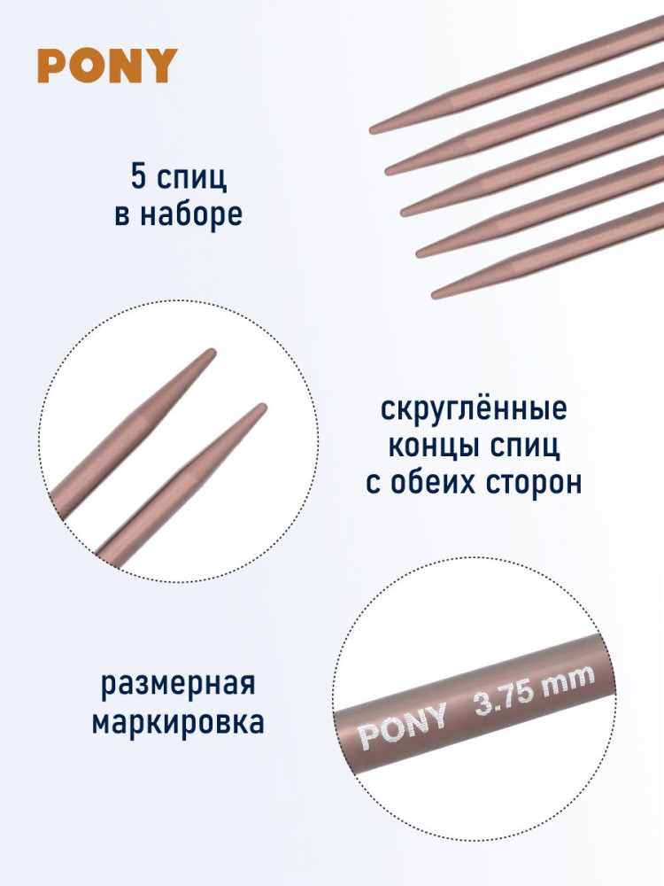 Спицы для вязания носочные Pony Colour — специализированный инструмент, идеально подходящий для вязания изделий в круговой технике, таких как носки, чулки, гетры, манжеты и горловины свитеров. Спицы изготовлены из легкого и прочного алюминия: это сочетание позволит часами наслаждаться процессом вязания без напряжения в руках. Легкий алюминий обеспечит вам комфорт даже при работе над крупными проектами. Особого внимания заслуживает технология обработки поверхности спицы — цветное покрытие (анодирование). Эта процедура защищает алюминий от коррозии, продлевает срок службы инструмента и обеспечивает плавное скольжение пряжи. Яркий и эстетичный цвет не только радует глаз, но и помогает быстро найти нужные спицы в вашей шкатулке рукоделия. Спицы практически не гнутся, сохраняя свою форму даже при интенсивном использовании. Безупречно гладкая поверхность спиц предотвращает зацепки и образование узелков. Ваша нить будет двигаться свободно и плавно, создавая ровное полотно. Слегка закругленные концы спиц мягко скользят между петлями, не цепляясь за волокна. Кроме того, закругленные концы не травмируют пальцы.