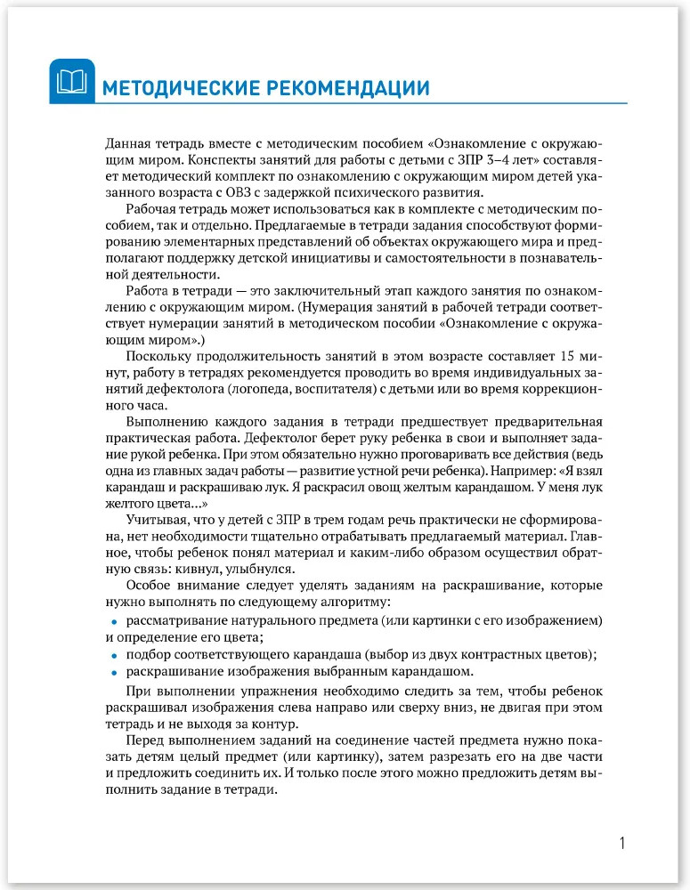 Серия: От рождения до школы Данная тетрадь вместе с методическим пособием «Ознакомление с окружающим миром. Конспекты занятий для работы с детьми с ЗПР 3–4 лет» составляет методический комплект по ознакомлению с окружающим миром детей указанного возраста с ОВЗ с задержкой психического развития. Рабочая тетрадь может использоваться как в комплекте с методическим пособием, так и отдельно. Предлагаемые в тетради задания способствуют формированию элементарных представлений об объектах окружающего мира и предполагают поддержку детской инициативы и самостоятельности в познавательной деятельности. |