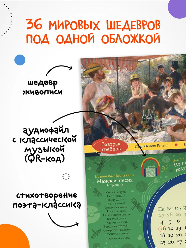 Интерактивный календарь 2026 «Мировые шедевры для культурных детей» познакомит вашего ребенка с выдающимися произведениями мировой поэзии, живописи и музыки. Целых 36 мировых шедевров классики под одной обложкой! Из этого интерактивного издания дети узнают не только выдающиеся произведения европейской живописи (Ренуара, Ван Гога, Брейгеля, Боттичелли, Матисса) и музыки (Шопена, Баха, Моцарта, Дебюсси, Бетховена, Грига), но и приобщатся к культурному наследию своей страны. В календаре представлены известные произведения великих русских художников, предоставленные Третьяковской галереей и Русским музеем (Серов, Васнецов, Шишкин, Врубель, Кустодиев), стихи русских поэтов (Блока, Лермонтова, Тютчева, Мандельштама, Бунина, Северянина), музыка выдающихся русских композиторов (Чайковского, Прокофьева, Мусоргского, Римского-Корсакова). |