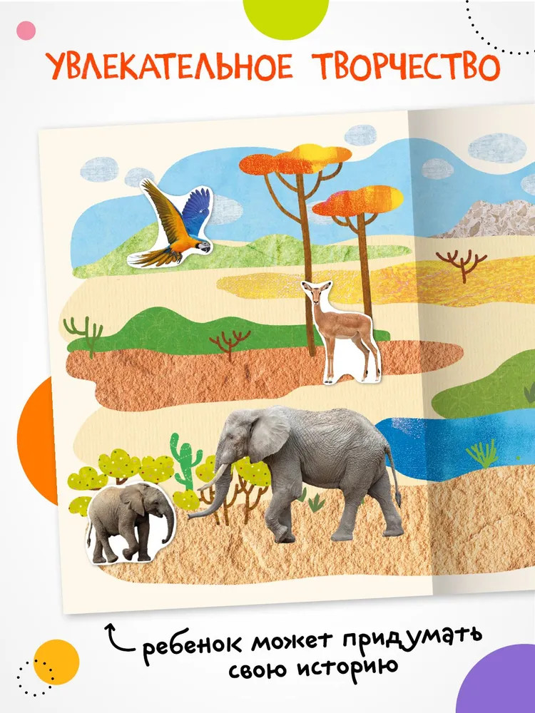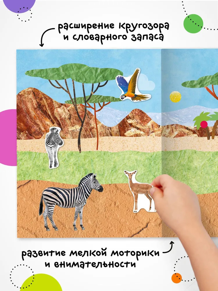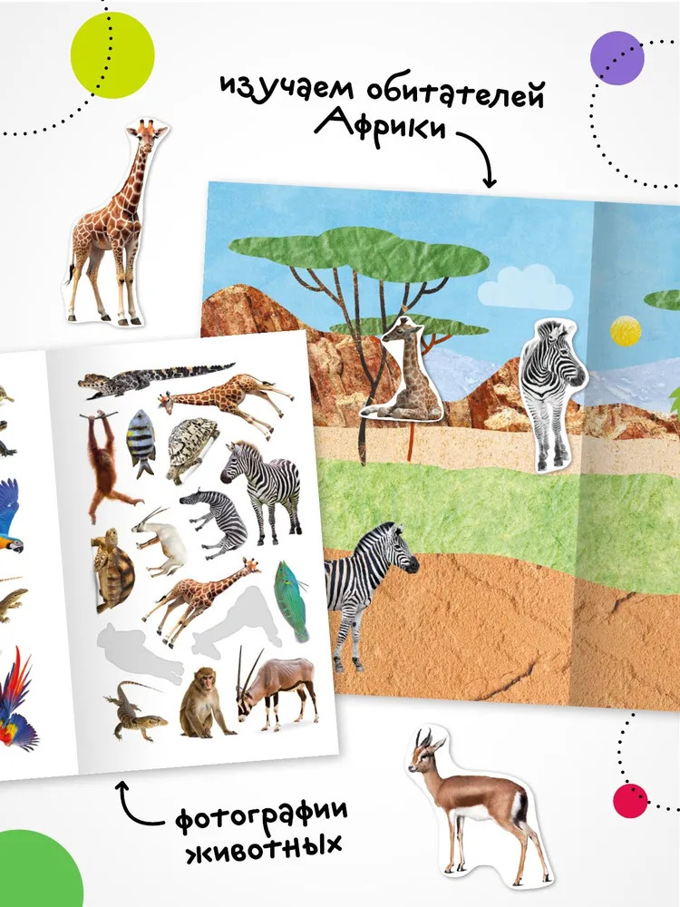 Серия: Фотонаклейки Книга «В Африке» серии «Фотонаклейки» — настоящая находка для развития воображения ребенка. Яркие страницы с коллажными иллюстрациями нужно заполнить разными животными. На каждом развороте дано животное-подсказка, но ребенок может придумать и свою историю. Все наклейки — это фотографии обитателей Африки, а это значит, что ребенок сможет поближе с ними познакомиться. Благодаря этой книжке малыш потренирует мелкую моторику, аккуратность и расширит кругозор. |