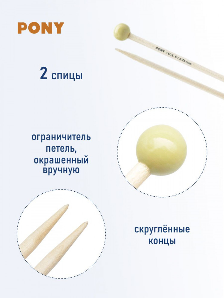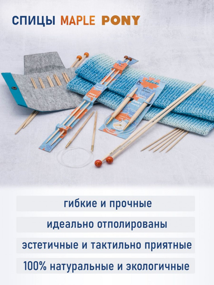 Сами спицы изготовлены из качественной, плотной и упругой древесины клена. Клен — это прочный и износостойкий материал, который практически не стучит при вязании. Кленовые спицы долговечны, они не скалываются и не ломаются. Тщательно отшлифованные спицы обладают гладкой, шелковистой поверхностью. Кроме того, использование таких спиц помогает защитить пальцы вязальщицы от травмирования. Они не повреждают структуру нити и приятны на ощупь во время вязания. Ограничители для спиц надежно удерживают петли, а также служат украшением благодаря покрытию природным красителем. Для тех, кто любит путешествовать, спицы Pony Maple станут отличным спутником: многие авиаперевозчики позволяют провозить деревянные спицы вместе с ручной кладью в пассажирском салоне. Вы всегда сможете иметь под рукой любимые инструменты для вязания, где бы вы ни находились. Спицы для вязания прямые Pony Maple станут незаменимым инструментом для любой мастерицы, которая ценит красоту и качество в каждой детали.