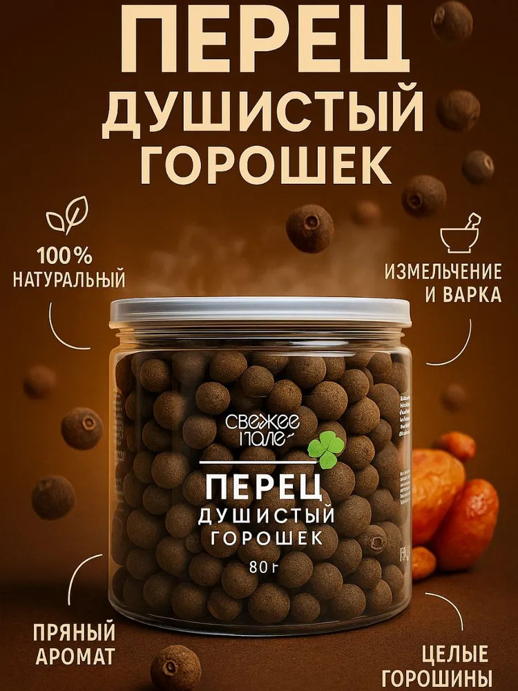 Перец душистый горошек от бренда Свежее Поле — станет настоящей находкой для любителей ароматных и душистых пряностей. Натуральный продукт сохраняет насыщенный аромат и вкусовые характеристики, которые полностью раскрываются при помоле в мельнице непосредственно перед использованием. Черный перец горошком подходит для разнообразных кулинарных применений и является обязательным компонентом многих традиционных блюд. Полезные свойства душистого перца обусловлены его природным составом. Продукт стимулирует пищеварительные процессы, способствуя выработке желудочного сока и улучшению усвоения питательных веществ. Антиоксидантные и противовоспалительные характеристики перца помогают защитить клетки организма и могут способствовать ускорению метаболизма.