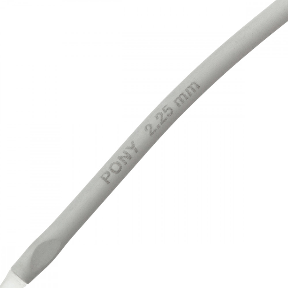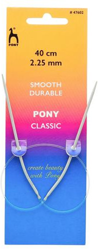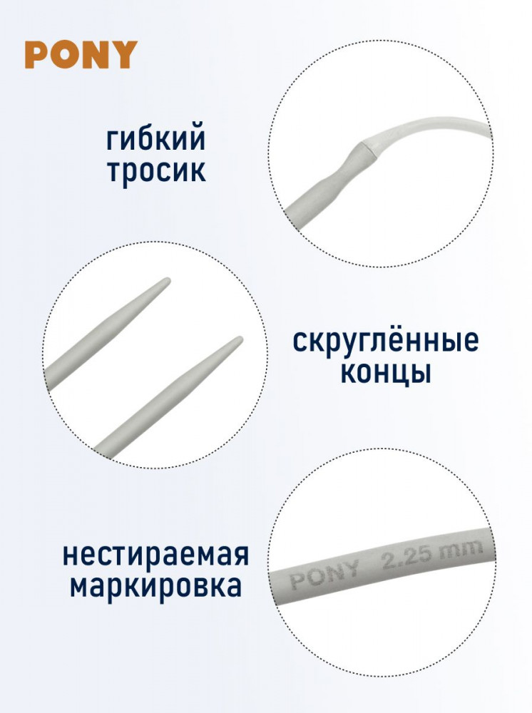 Слегка закругленные концы спиц мягко скользят между петлями, не цепляясь за волокна. Кроме того, закругленные концы не травмируют пальцы. Пластиковый тросик — прочный, гибкий, гладкий и не перекручивается в процессе работы. Чтобы петли было удобно перекидывать и снимать, спицы слегка искривлены и сужаются на переходе к тросику. Круговые спицы Pony снабжены нестираемой маркировкой с указанием размера, позволяя легко выбирать нужный инструмент для конкретного проекта. Круговые спицы Pony — это выбор качества, комфорта и безупречного результата в вашем вязальном творчестве. Они станут незаменимыми помощниками для опытных мастериц и прекрасным инструментом для начинающих рукодельниц.