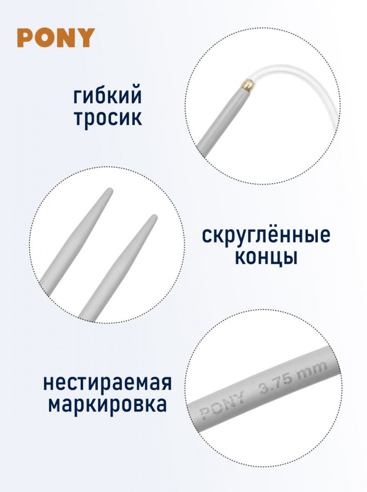 Слегка закругленные концы спиц мягко скользят между петлями, не цепляясь за волокна. Кроме того, закругленные концы не травмируют пальцы. Пластиковый тросик — прочный, гибкий, гладкий и не перекручивается в процессе работы. Чтобы петли было удобно перекидывать и снимать, спицы слегка искривлены и сужаются на переходе к тросику. Круговые спицы Pony снабжены нестираемой маркировкой с указанием размера, позволяя легко выбирать нужный инструмент для конкретного проекта. Круговые спицы Pony — это выбор качества, комфорта и безупречного результата в вашем вязальном творчестве. Они станут незаменимыми помощниками для опытных мастериц и прекрасным инструментом для начинающих рукодельниц.
