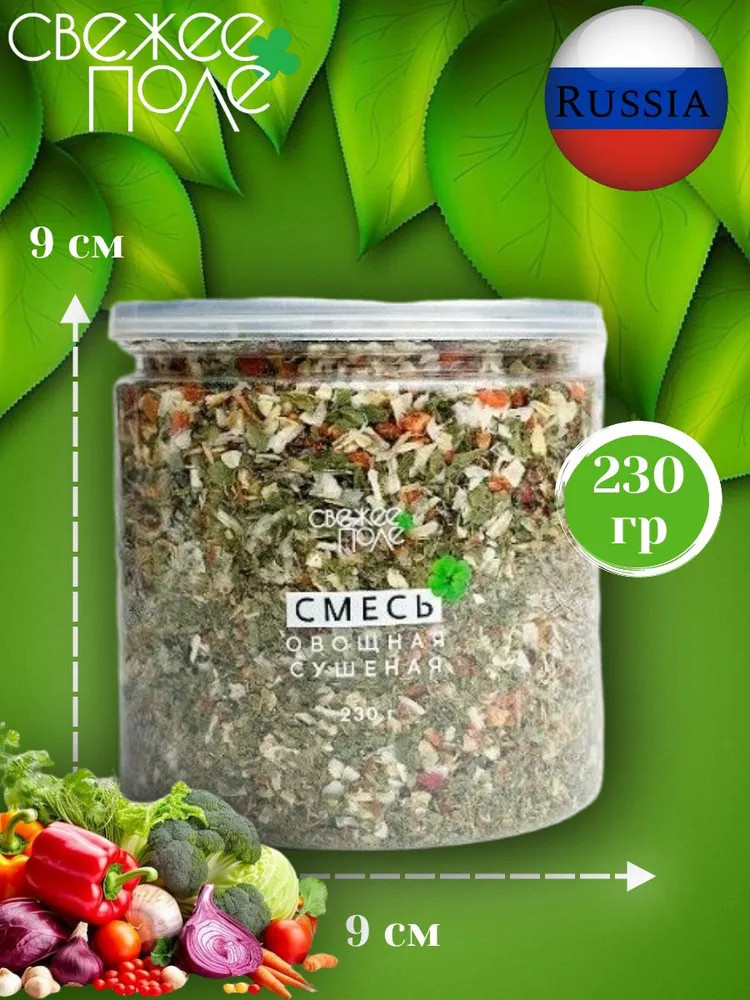 Овощная смесь сушеная, резаная в банке от Свежее Поле 230 гр — это универсальная приправа и настоящий суперфуд для здорового питания, который станет вашим незаменимым помощником на кухне. Этот продукт идеально подходит для здорового и правильного питания, улучшения пищеварения и омоложения организма. В составе этой ароматной композиции — тщательно отобранные резаные овощи и зелень: морковь, лук, красная паприка, укроп, петрушка, репка и чеснок, которые создают идеальный баланс вкуса и пользы. Продукт полностью натуральный, без добавления соли, сахара, искусственных ароматизаторов и консервантов, что делает его идеальным выбором для тех, кто следит за своим питанием. Морковь богата каротином, который поддерживает здоровье глаз и иммунную систему. Паприка и чеснок содержат антиоксиданты, способствующие улучшению сердечно-сосудистого здоровья и снижению воспалительных процессов. Укроп и петрушка богаты витаминами и минералами, что способствует улучшению пищеварения и метаболизма. В целом, такая смесь может помочь укрепить общий тонус организма и поддержать здоровье на клеточном уровне.