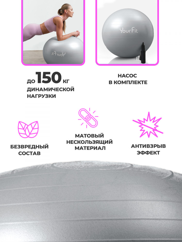Антискользящее покрытие Матовая микрорельефная поверхность с кольцевой текстурой, как правило, скольжение ладоней и одежды, улучшает контроль в планках, скручиваниях и балансировках. Такой «массажный рельеф» придает легкий тактильный эффект во время тренировок. Фитбол — функциональный тренажер, который помогает усилить безопасную нагрузку, улучшить подвижность и координацию.