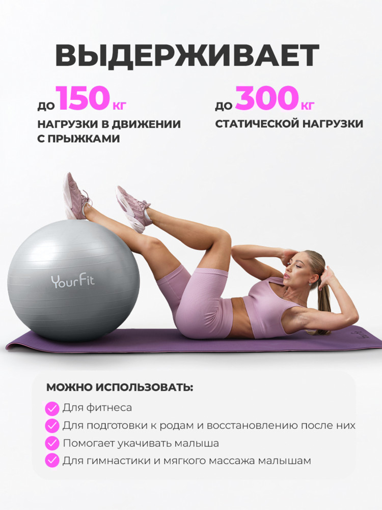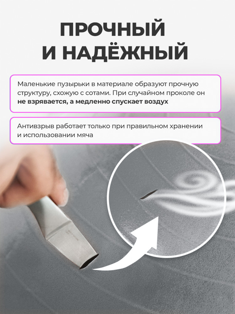 Материал и безопасность Эластичный ПВХ с системой антивзрыв (Anti-Burst). Даже при проколе мяч не лопается резко, медленно стравливает воздух — это повышает безопасность во время занятий. В описаниях мяча иногда называют «резиновый» — речь идет о прочном эластичном ПВХ. Плотность материала и максимальная нагрузка Плотный многослойный ПВХ сохраняет форму и обеспечивает стабильную опору в упражнениях. Максимально допустимая нагрузка для данной модели указана в характеристиках товара (ориентируйтесь на ваш вес и тип тренировки). Диаметр и регулировка жёсткости Диаметр подбирают по высоте: 65 см — рост примерно 165–180 см; 75 см — рост 180 см и выше. Жёсткость просто регулирует уровень накачивания: чуть мягче — для расслабления и растяжки, плотнее — для силовых и статических поз.