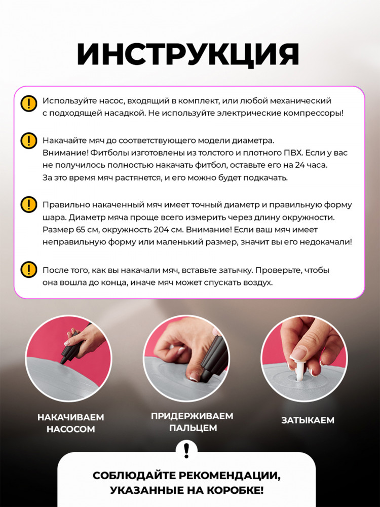 Внимание! Перед первым использованием накачайте фитбол до рекомендуемого диаметра, дайте материалу «устояться» 12–24 часа и при необходимости немного подкачайте. Храните вдали от внешних предметов и источников тепла.