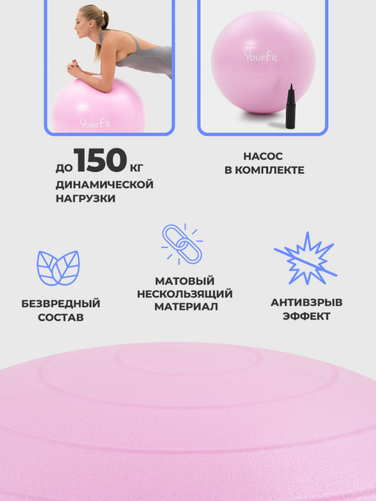 Антискользящее покрытие Матовая микрорельефная поверхность с кольцевой текстурой, как правило, скольжение ладоней и одежды, улучшает контроль в планках, скручиваниях и балансировках. Такой «массажный рельеф» придает легкий тактильный эффект во время тренировок. Фитбол — функциональный тренажер, который помогает усилить безопасную нагрузку, улучшить подвижность и координацию.
