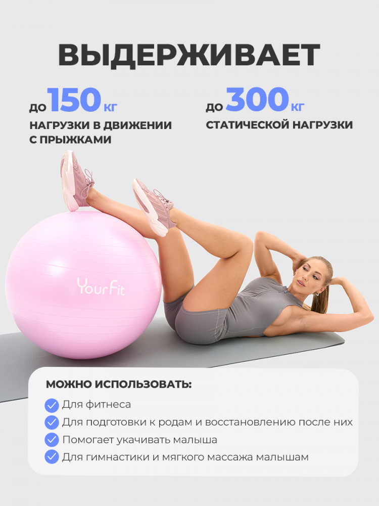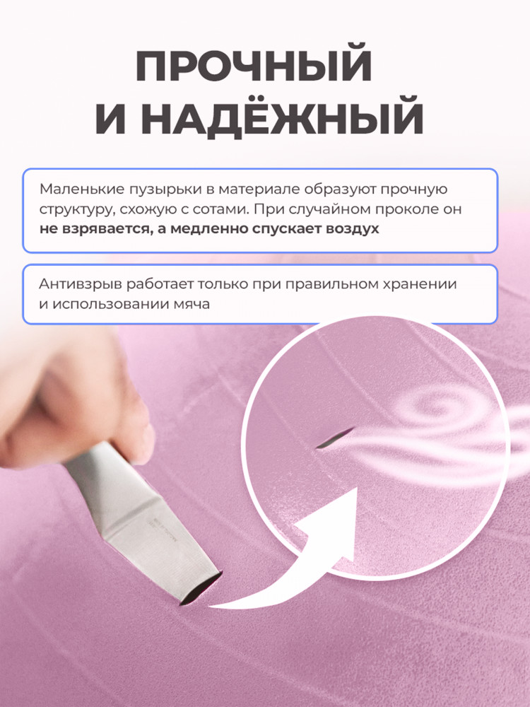 Материал и безопасность Эластичный ПВХ с системой антивзрыв (Anti-Burst). Даже при проколе мяч не лопается резко, медленно стравливает воздух — это повышает безопасность во время занятий. В описаниях мяча иногда называют «резиновый» — речь идет о прочном эластичном ПВХ. Плотность материала и максимальная нагрузка Плотный многослойный ПВХ сохраняет форму и обеспечивает стабильную опору в упражнениях. Максимально допустимая нагрузка для данной модели указана в характеристиках товара (ориентируйтесь на ваш вес и тип тренировки). Диаметр и регулировка жёсткости Диаметр подбирают по высоте: 65 см — рост примерно 165–180 см; 75 см — рост 180 см и выше. Жёсткость просто регулирует уровень накачивания: чуть мягче — для расслабления и растяжки, плотнее — для силовых и статических поз.