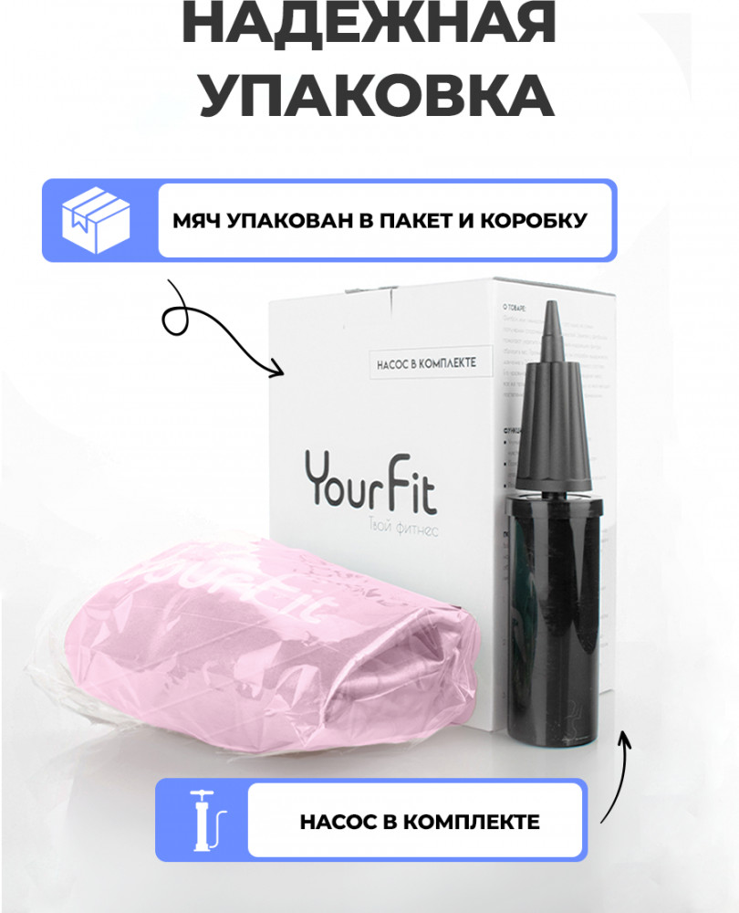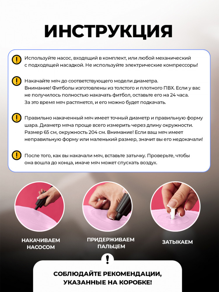 Внимание! Перед первым использованием накачайте фитбол до рекомендуемого диаметра, дайте материалу «устояться» 12–24 часа и при необходимости немного подкачайте. Храните вдали от внешних предметов и источников тепла.