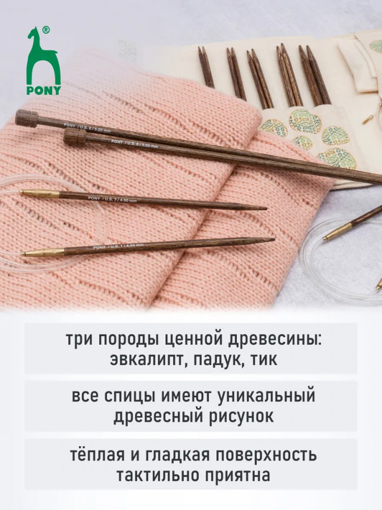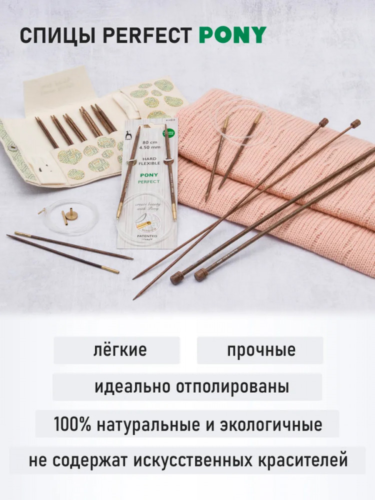 Для изготовления спиц используется древесина трех редких пород дерева: эвкалипта, падука и тика. Заготовка сырья ведется в лесах, где посадки деревьев возобновляются, позволяя избежать ущерба для природы. Тщательно отшлифованные спицы обладают гладкой, шелковистой поверхностью. Они не повреждают структуру нити и приятны на ощупь во время вязания. Каждая пара спиц имеет уникальный древесный рисунок. Запатентованная система соединения лески Glydon обеспечивает невероятно плавное скольжение петель по тросику, предотвращая запутывание и облегчая процесс вязания. Тросик из прозрачного мягкого пластика — прочный, легкий и гибкий. Для тех, кто любит путешествовать, спицы Pony Perfect станут отличным спутником: многие авиаперевозчики позволяют провозить деревянные спицы вместе с ручной кладью в пассажирском салоне. Вы всегда сможете иметь под рукой любимые инструменты для вязания, где бы вы ни находились. Спицы Pony Perfect станут незаменимым инструментом для любой мастерицы, которая ценит красоту и качество в каждой детали.