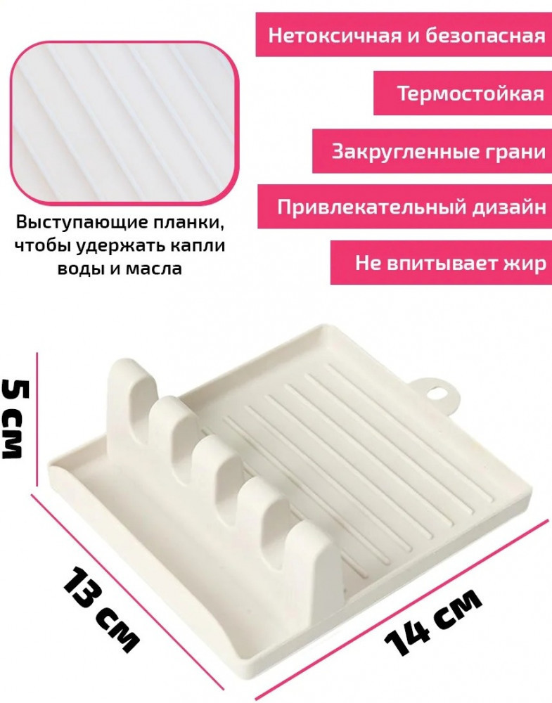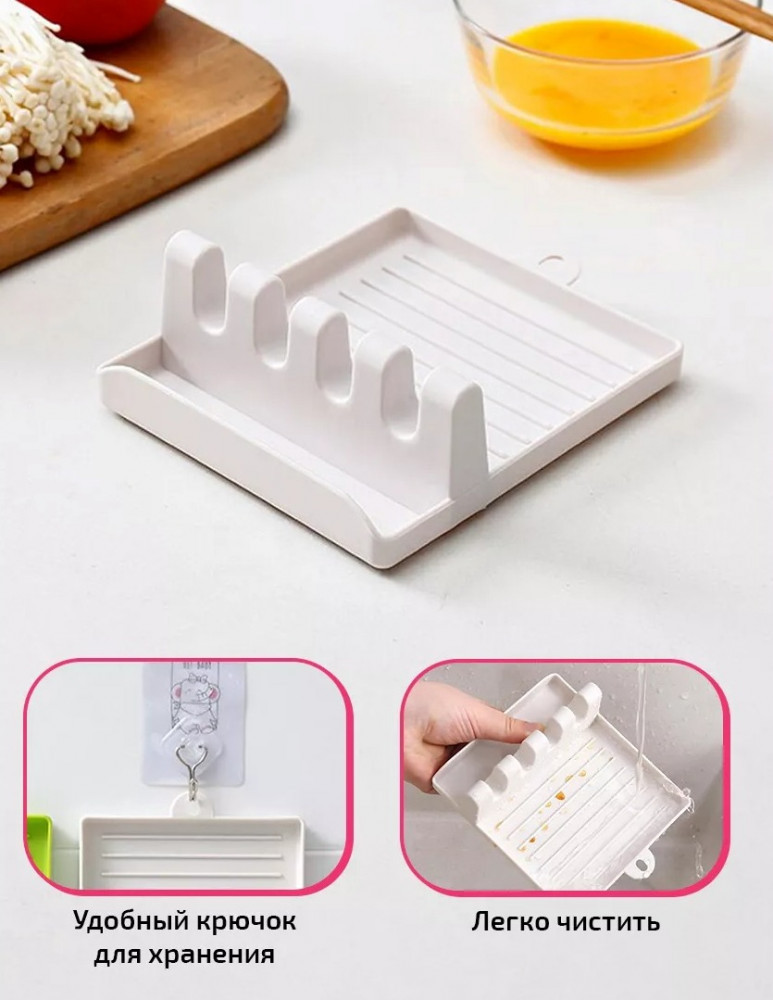 Универсальная подставка для кухонных принадлежностей используется во время процесса готовки и предназначена для размещения на ней ложек, вилок, лопаток, поварешек, посуды столовой и тому подобное, организует порядок на кухне. Этот аксессуар для кухни — прекрасный держатель для кухонных крышек и сушки посуды. Поставьте пластиковый органайзер рядом с плитой во время варки и по необходимости откладывайте кухонные приборы на держатель. Жидкость, оставшаяся на ложке или крышке, стечет в углубление подставки, таким образом, оставляя чистыми столешницу и сам прибор. Высота бортиков настольного держателя не позволяет скопившейся жидкости проливаться на стол. Кухонная подставка под горячее для ложек и крышек изготовлена из термостойкого пищевого пластика. На нее возможно ставить горячие приборы. Материал не впитывает жир и запахи пищи. После использования рекомендуется промыть под струей теплой воды с использованием моющих средств. |
