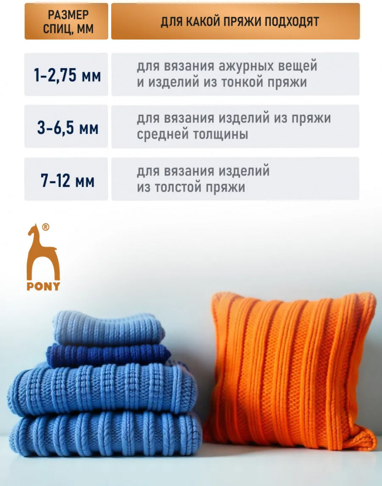 Спицы практически не гнутся, сохраняя свою форму даже при интенсивном использовании. Безупречно гладкая поверхность спиц предотвращает зацепки и образование узелков. Ваша нить будет двигаться свободно и плавно, создавая ровное полотно. Слегка закругленные концы спиц мягко скользят между петлями, не цепляясь за волокна. Кроме того, закругленные концы не травмируют пальцы. Специальные наконечники предотвращают соскальзывание петель, сохраняя вашу работу в целости. Размер спиц указан на наконечнике для быстрого и удобного поиска. Особое внимание следует уделить правильному выбору размера спиц в соответствии с толщиной пряжи. Слишком толстые спицы приведут к рыхлой вязке, а слишком тонкие- к плотной и жесткой. Рекомендации по выбору размера спиц обычно указываются на этикетке пряжи. Прямые спицы Пони представляют собой надежный и удобный инструмент для вязания различных изделий, особенно для начинающих вязальщиков и для тех, кто ценит комфорт и легкость в работе. Они станут незаменимыми помощниками в создании красивых и уютных вещей своими руками.