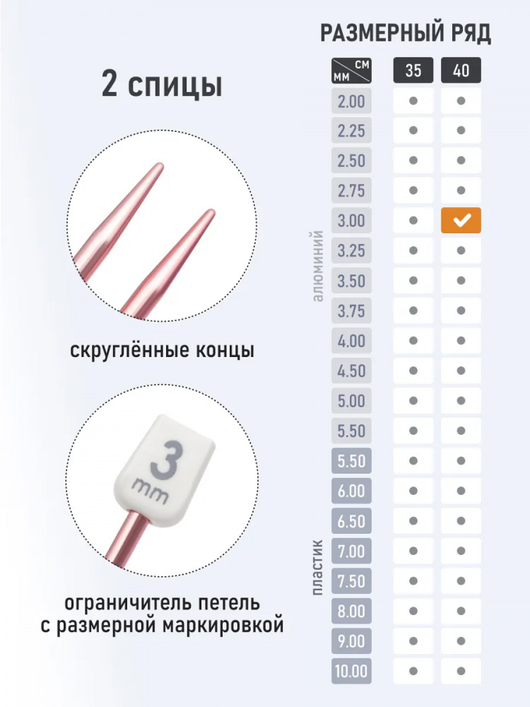 Спицы практически не гнутся, сохраняя свою форму даже при интенсивном использовании. Безупречно гладкая поверхность спиц предотвращает зацепки и образование узелков. Ваша нить будет двигаться свободно и плавно, создавая ровное полотно. Слегка закругленные концы спиц мягко скользят между петлями, не цепляясь за волокна. Кроме того, закругленные концы не травмируют пальцы. Спицы Pony снабжены нестираемой маркировкой с указанием размера, позволяя легко выбирать нужный инструмент для конкретного проекта. Вязание с помощью спиц Pony Colour превратится в настоящее удовольствие, даря радость творчества и вдохновляя на создание уникальных и неповторимых вещей.