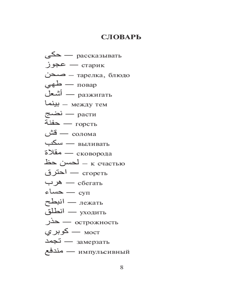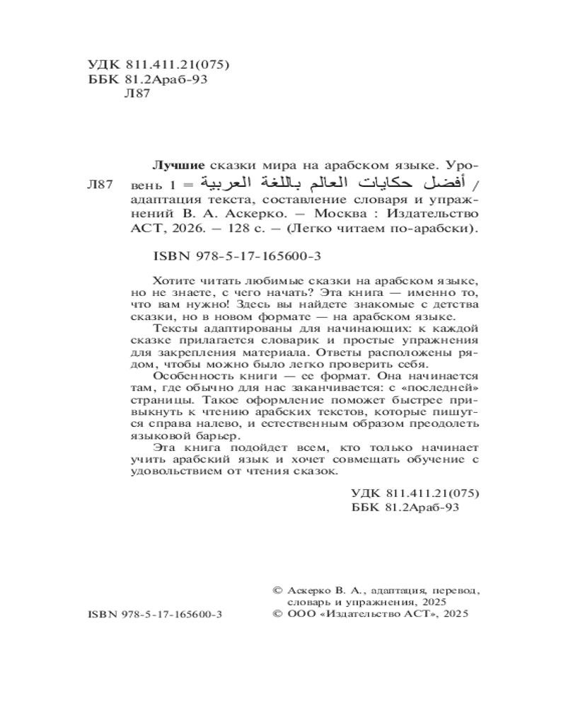 Хотите читать любимые сказки на арабском языке, но не знаете, с чего начать? Эта книга — именно то, что вам нужно! Здесь вы найдете классические сказки, знакомые с детства, но в новом формате — на арабском языке. Тексты адаптированы для начинающих: к каждой сказке прилагается словарик и простые упражнения для закрепления материала. Ответы расположены рядом, чтобы можно было легко проверить себя. Особенность книги — ее формат. Она начинается там, где обычно для нас заканчивается: с «последней» страницы. Такое оформление поможет быстрее привыкнуть к чтению арабских текстов, которые пишутся справа налево, и естественным образом преодолеть языковой барьер. Эта книга подойдет всем, кто только начинает учить арабский язык и хочет совмещать обучение с удовольствием от чтения сказок.