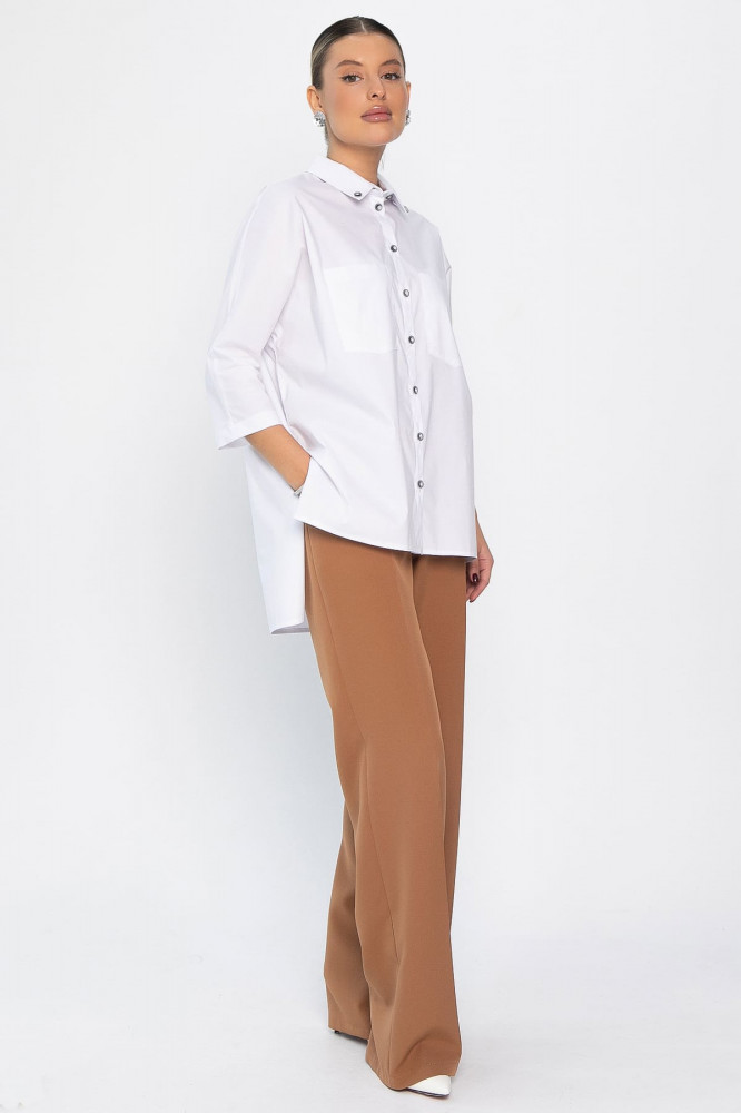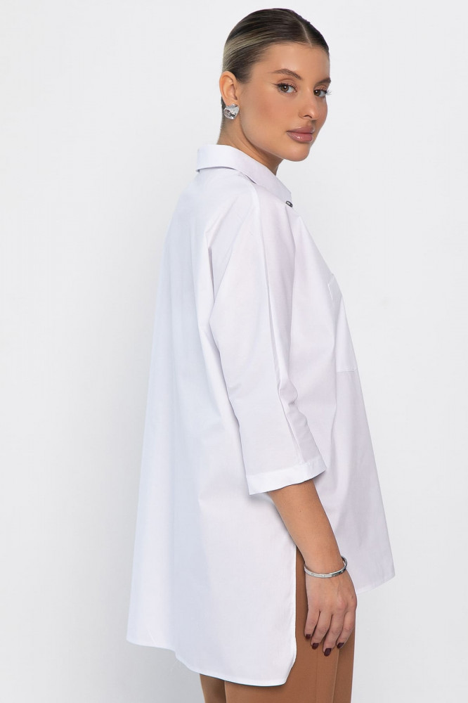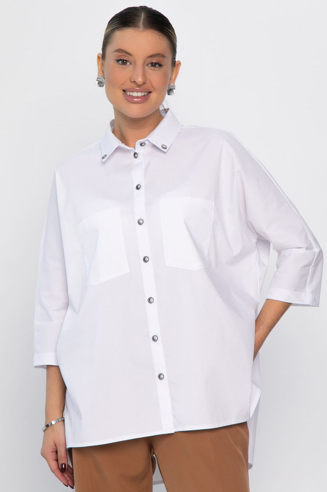Стильная рубашка — базовая основа гардероба! Подходит как для офиса, так и для учёбы. Рукава длиной 3/4, два накладных кармана, длина рубашки сзади длиннее, чем спереди. Оверсайз-модель придает стильный и современный вид, при этом прекрасно скрывая все недостатки фигуры. Это великолепный выбор для тех, кто предпочитает оригинальность и стиль в своем аутфите. Прекрасно сочетается с различными низами и аксессуарами.