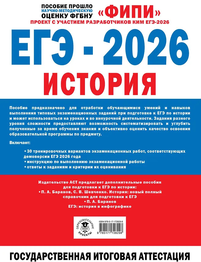 Серия: ФИПИ-школьникам Пособие прошло научно-методическую оценку ФГБНУ «ФИПИ». Проект с участием разработчиков КИМ ЕГЭ-2026. Пособие предназначено для отработки обучающимися умений и навыков выполнения типовых экзаменационных заданий при подготовке к ЕГЭ по истории и может использоваться на уроках и во внеурочной деятельности. Задания разного уровня сложности предоставляют возможность систематизировать и углубить полученные за время обучения знания и объективно оценить качество освоения образовательной программы по предмету. |