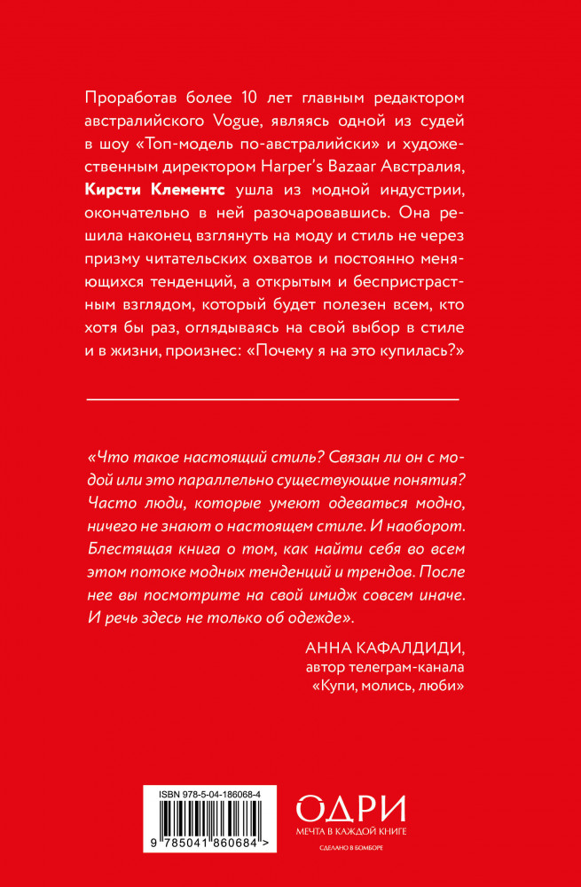 💳 Оплатить за товар можно при получении 🇰🇿 Есть бесплатная доставка по Казахстану от 1 дня 🎁 Копите бонусы с каждой покупки Серия: Модная психология Проработав более 10 лет главным редактором австралийского Vogue, являясь одной из судей в шоу «Топ-модель по-австралийски» и художественным директором Harper’s Bazaar Австралия, Кирсти Клементс ушла из модной индустрии, окончательно в ней разочаровавшись. Она решила наконец взглянуть на моду и стиль не через призму читательских охватов и постоянно меняющихся тенденций, а открытым и беспристрастным взглядом, который будет полезен всем, кто хотя бы раз, оглядываясь на свой выбор в стиле и в жизни, произнес: «Почему я на это купилась?» |