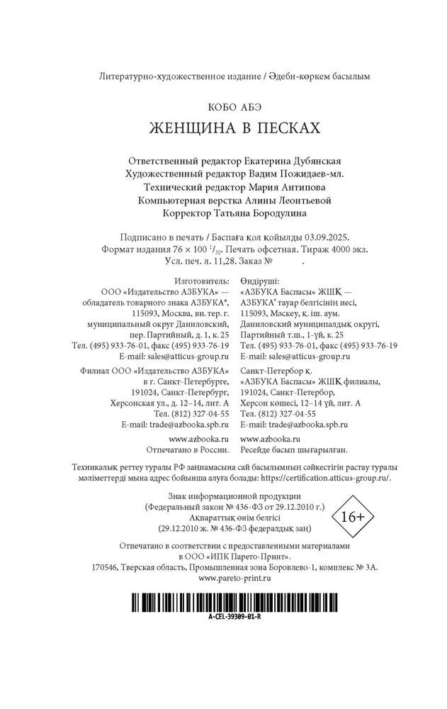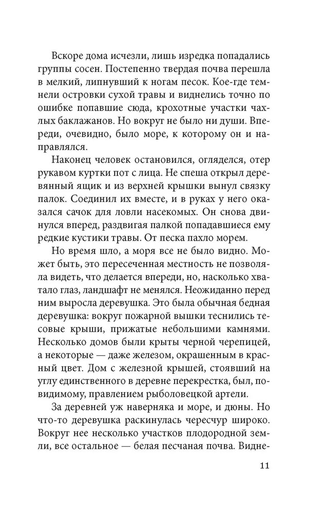 💳 Оплатить за товар можно при получении 🇰🇿 Есть бесплатная доставка по Казахстану от 1 дня 🎁 Копите бонусы с каждой покупки Серия: Изящная классика Востока Ники Дзюмпей, скромный энтомолог-любитель, хотел провести на побережье три дня отпуска и пополнить свою коллекцию жуков и бабочек. Вместо этого он оказался в ловушке — в яме среди безбрежных песков, в доме, построенном на песке. Здесь живет женщина, которая день и ночь сражается с этим неумолимым песком, грозящим засыпать дом. Этот песок — словно сама смерть, сама безысходность, он стирает в пыль всякую надежду, но требует ежедневной битвы с собой. И в его глубине таится жизнь-вода... |