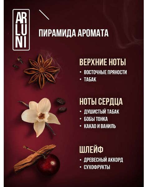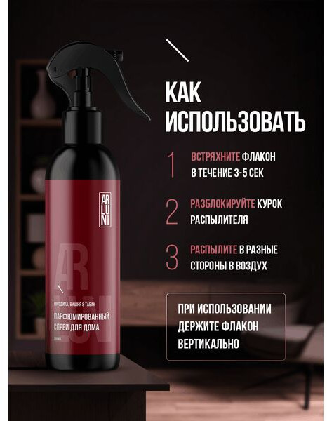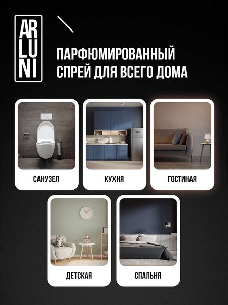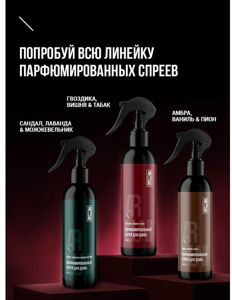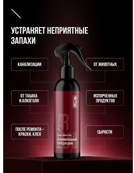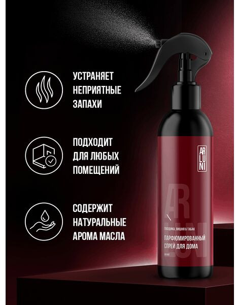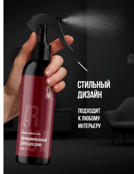 Парфюмированный спрей для дома и туалета Arluni — эффективное средство бытовой химии, которое обеспечивает мгновенное устранение неприятных запахов и надолго сохраняет свежесть воздуха в вашем доме. Чувственная древесная композиция с яркими нотами сладкой ванили и нежными цветочными аккордами пиона — это та самая, неповторимая композиция ароматов, создающая атмосферу чистоты и гармонии не только в туалете, кухне или ванной комнате. Но и в любых других помещениях вашей квартиры или дома. Многосоставная парфюмерная композиция продукта постепенно раскрывает свои ноты, погружая вас в очаровательную обстановку безмятежности и умиротворения. Универсальный освежитель воздуха наполнит свежестью и чистотой каждую из комнат вашей квартиры. Он легко устранит запахи табака и сигарет, а также нейтрализует специфические ароматы, остающиеся после домашних животных (кошек и собак). Водный парфюмированный спрей для дома подходит для использования в гардеробных и других помещениях, где хочется создать атмосферный аромат. Освежитель для дома не только обеспечивает приятную ароматизацию в комнатах, но и способствует осаждению пыли в момент распыления. Освежитель воздуха от неприятных запахов туалетный Arluni имеет удобный распылитель, который обеспечивает равномерное распределение аромата по всему пространству. Парфюмерный спрей можно использовать как во время уборки, так и для ежедневной ароматизации помещений.