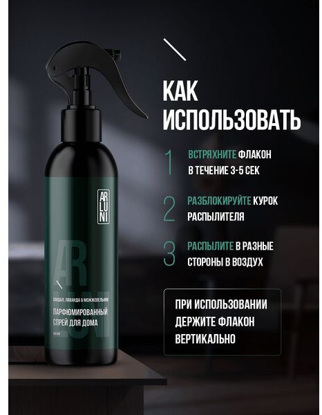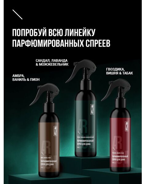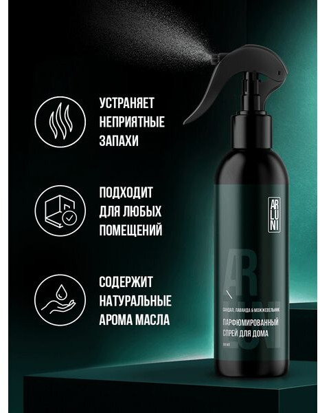 Парфюмированный спрей для дома и туалета Arluni — эффективное средство бытовой химии, которое обеспечивает мгновенное устранение неприятных запахов и надолго сохраняет свежесть воздуха в вашем доме. Чувственная древесная композиция с яркими нотами сладкой ванили и нежными цветочными аккордами пиона — это та самая, неповторимая композиция ароматов, создающая атмосферу чистоты и гармонии не только в туалете, кухне или ванной комнате. Но и в любых других помещениях вашей квартиры или дома. Многосоставная парфюмерная композиция продукта постепенно раскрывает свои ноты, погружая вас в очаровательную обстановку безмятежности и умиротворения. Универсальный освежитель воздуха наполнит свежестью и чистотой каждую из комнат вашей квартиры. Он легко устранит запахи табака и сигарет, а также нейтрализует специфические ароматы, остающиеся после домашних животных (кошек и собак). Водный парфюмированный спрей для дома подходит для использования в гардеробных и других помещениях, где хочется создать атмосферный аромат. Освежитель для дома не только обеспечивает приятную ароматизацию в комнатах, но и способствует осаждению пыли в момент распыления. Освежитель воздуха от неприятных запахов туалетный Arluni имеет удобный распылитель, который обеспечивает равномерное распределение аромата по всему пространству. Парфюмерный спрей можно использовать как во время уборки, так и для ежедневной ароматизации помещений.
