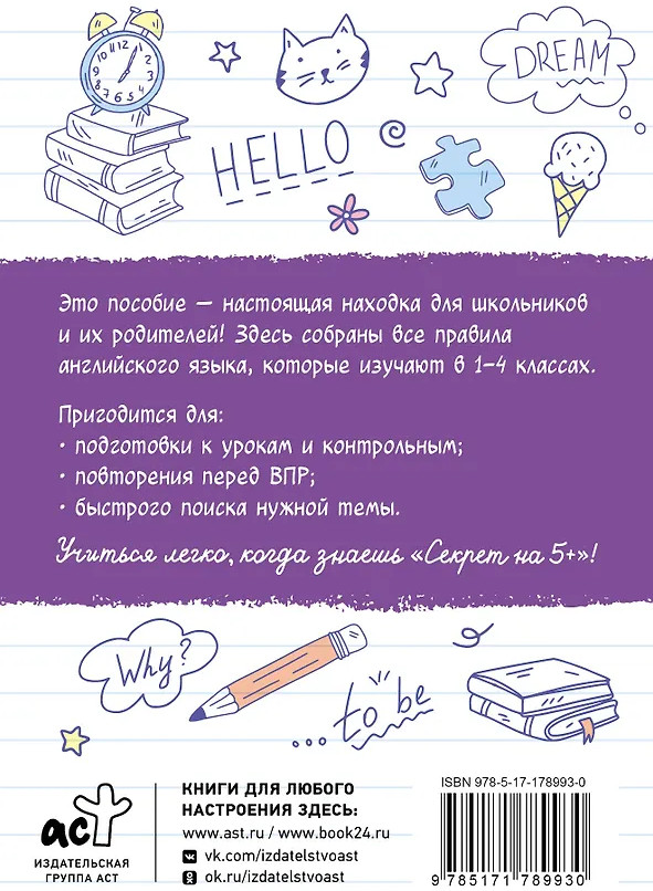 Серия: Секрет на 5+ В этом пособии собраны все основные правила английского языка, которые проходят в 1-4 классах, от орфографии до пунктуации. Материал изложен кратко, чётко и системно — так, чтобы ребёнку было легко запомнить, а взрослому — просто объяснить. Пособие подходит для регулярной подготовки к урокам, самостоятельной работы дома, повторения перед проверочными и контрольными работами. Предназначено для учащихся в начальной школе. |