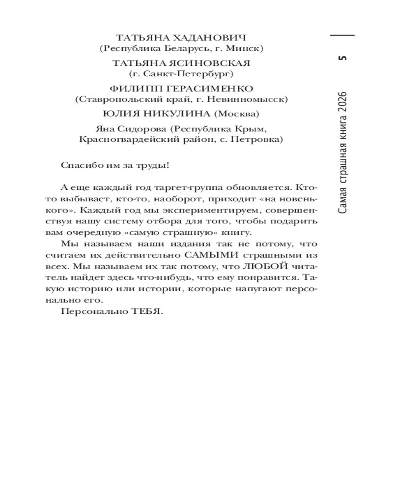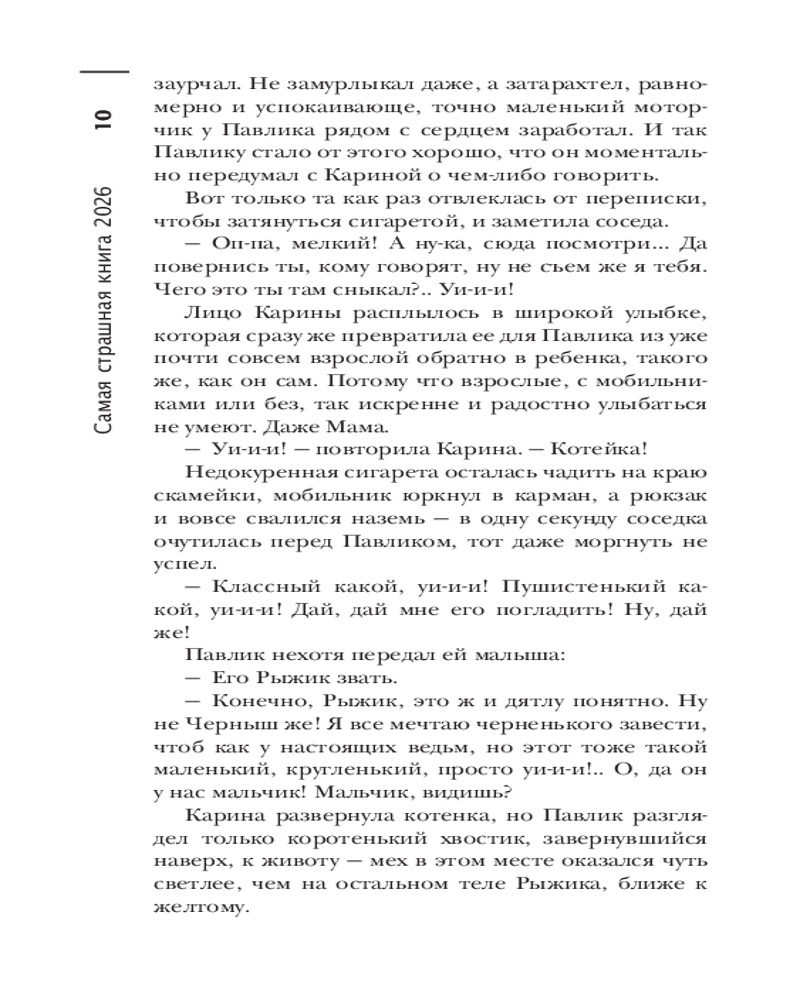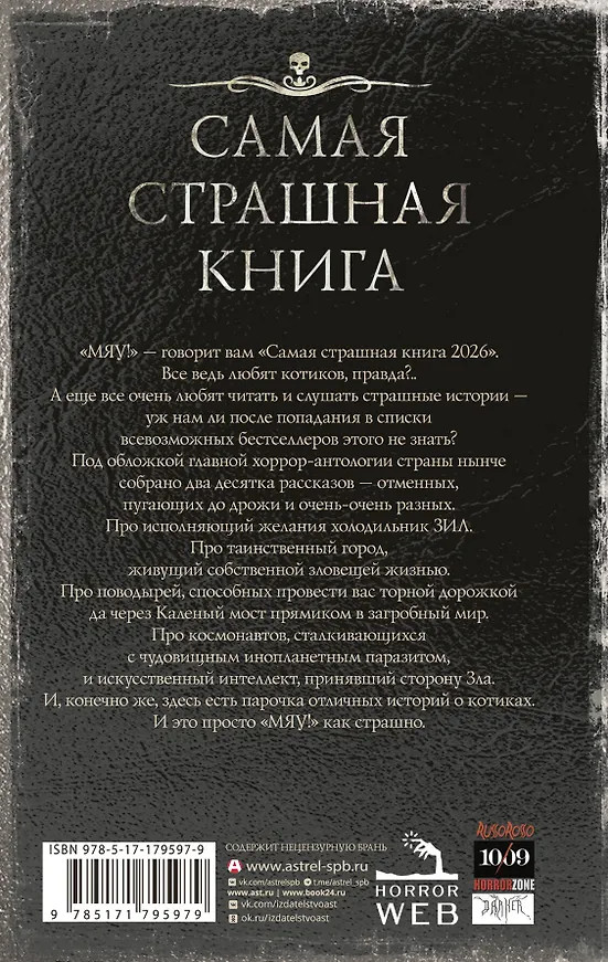 Серия: Самая страшная книга «МЯУ!» — говорит вам «Самая страшная книга 2026». Все ведь любят котиков, правда?.. А еще все очень любят читать и слушать страшные истории — уж нам ли после попадания в списки всевозможных бестселлеров этого не знать? Под обложкой главной хоррор-антологии страны нынче собрано два десятка рассказов — отменных, пугающих до дрожи и очень-очень разных. Про исполняющий желания холодильник ЗИЛ. Про таинственный город, живущий собственной зловещей жизнью. Про поводырей, способных провести вас торной дорожкой да через Каленый мост прямиком в загробный мир. Про космонавтов, сталкивающихся с чудовищным инопланетным паразитом, и искусственный интеллект, принявший сторону Зла. И, конечно же, здесь есть парочка отличных историй о котиках. И это просто «МЯУ!» как страшно. |