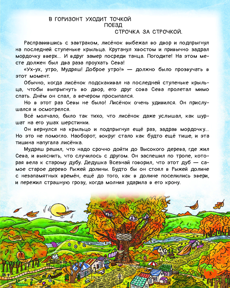 Серия: Волшебные приключения Желание путешествовать возникло у лисёнка Мудряша, когда его друг совёнок Сева улетел на юг. Но как можно исследовать новые места, если ты не умеешь летать, а в Рыжей долине нет даже железной дороги? На помощь приходит талантливый изобретатель дед Всезнай. Одна мечта способна изменить целый мир! Именно так и случилось в Рыжей долине. |