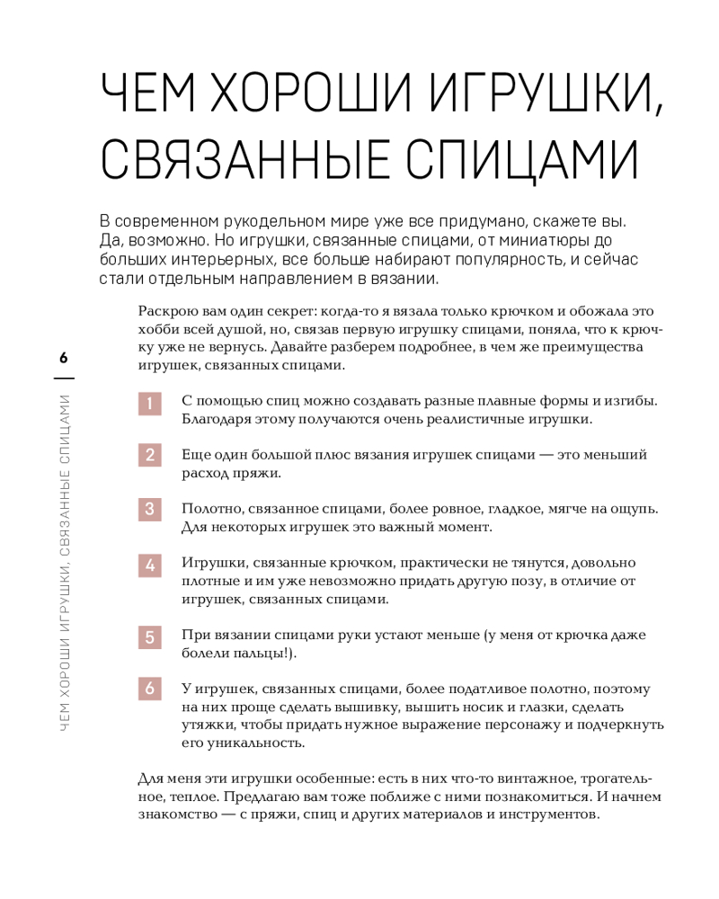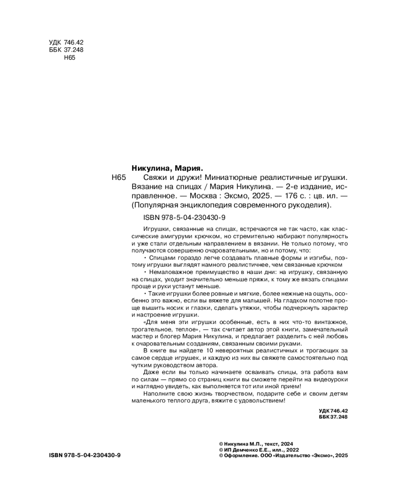 Серия: Популярная энциклопедия современного рукоделия В детской ладошке свернулся клубочком спящий серый котенок. На ваших спицах уже оживает потешка про двух веселых гусей в потешных шарфах, а очаровательные вязаные щеночки весело играют в своей корзинке! Авторские миниатюрные игрушки Марии Никулиной никого не оставляют равнодушным. А самое главное, они связаны не крючком, как привычные всем амигуруми, а на спицах. Такие игрушки гораздо мягче и пластичнее, пряжи на них уходит гораздо меньше, да и руки не так устают. Автор щедро делится секретами создания своих игрушек, от тонкостей технологии до создания образа. Откройте книгу, и вы непременно захотите подружиться с такими обаятельными реалистичными крохотными созданиями, связанными вашими руками! |