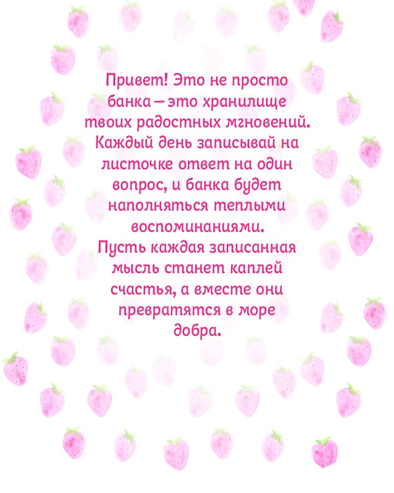Серия: Мечтай! Волшебные блокноты для тех, кто верит в чудеса Говорят, если в конце дня ты можешь вспомнить хотя бы одно приятное мгновение — ты уже счастливый человек. Но счастье — вещь хрупкая. Если его не сохранять, оно легко теряется, как сны на утро. Именно для этого и создана «Банка счастья» — чтобы стать бережным хранилищем твоих светлых моментов, которые делают жизнь по-настоящему теплой. Эта авторская методика уникальна и помогла обрести счастье тысячам людей. Каждый день здесь можно записывать моменты, которые подарили улыбку: теплое утро с чашкой любимого кофе, встречу с близкими, приятную мелочь, которая вдруг сделала день особенным. Неважно, большая это радость или крошечная деталь, — всё это станет твоими сокровищами, которые однажды превратятся в целую банку счастливых воспоминаний. |
