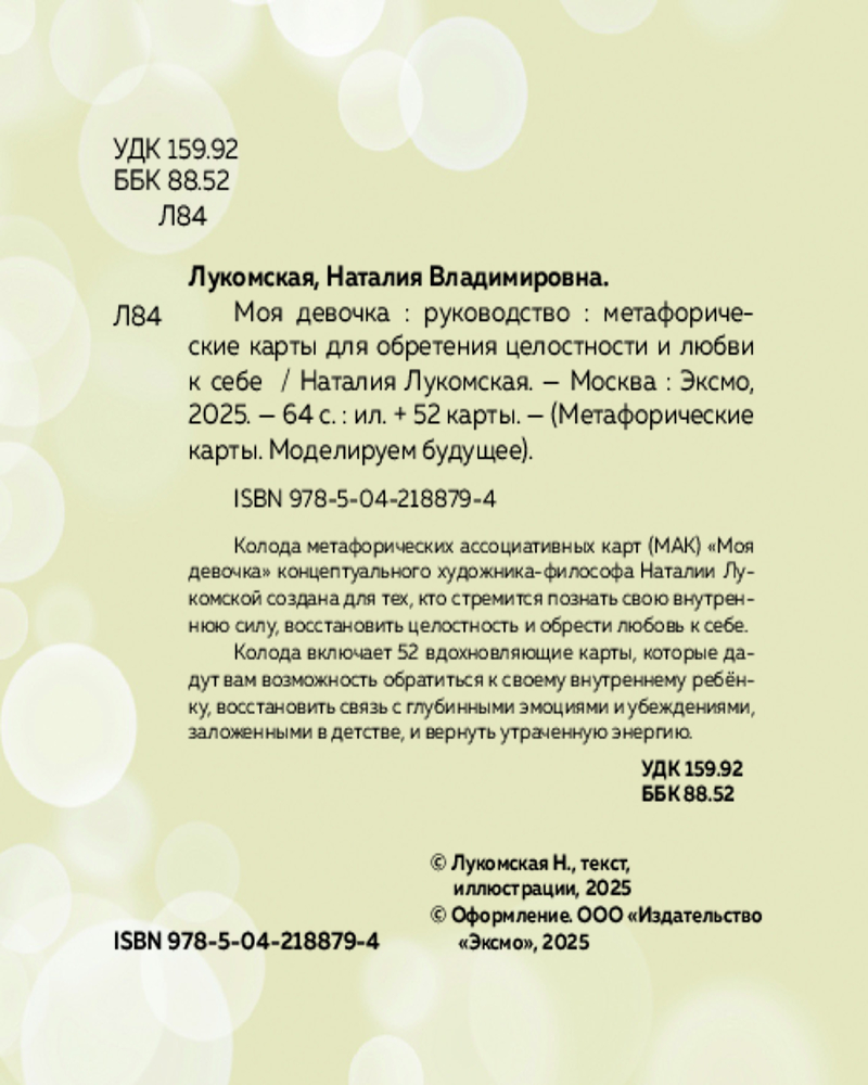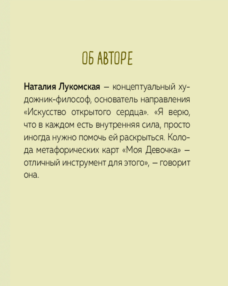 Колода метафорических ассоциативных карт (МАК) «Моя Девочка» художницы Наталии Лукомской создана для тех, кто стремится познать свою внутреннюю силу, восстановить целостность и любовь к себе.