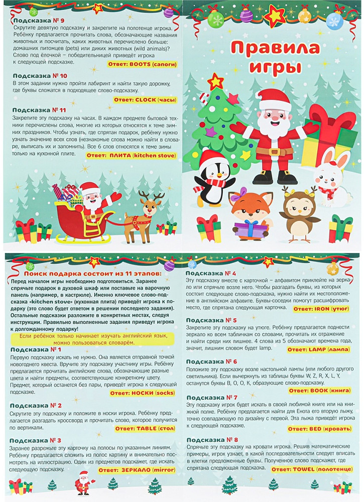 Новый год — самое волшебное время, когда хочется особенно порадовать своих близких! Детский квест по поиску подарка поможет весело и необычно вручить ваш презент. Кроме того, интересные задания будут развивать у малышей логическое мышление, смекалку и внимание. Всё уже готово, осталось только спрятать подарок в надёжном месте и следовать инструкции. Дети с большим удовольствием будут искать долгожданный сюрприз! |