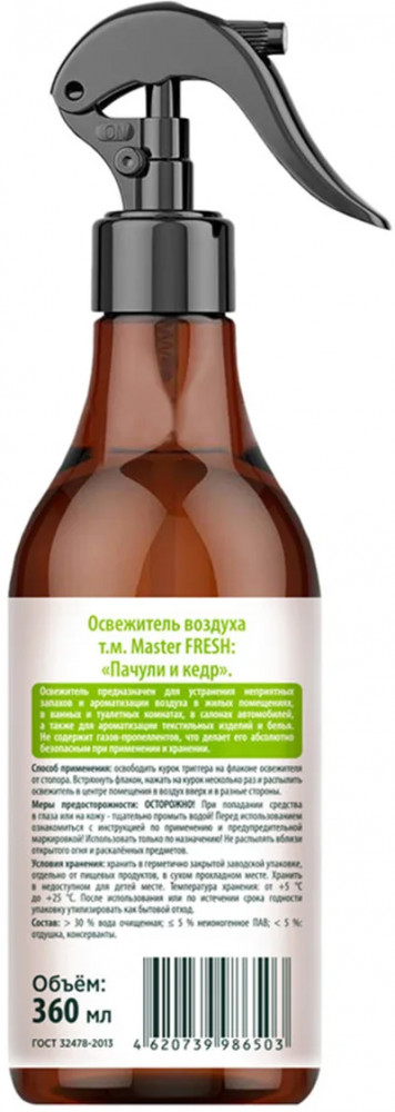 Формула освежителя на водной основе, без спирта и пропеллентов. Отдушки Master fresh — 99% биоразлагаемые, с увеличенной концентрацией парфюмерного масла (15%). Средство эффективно нейтрализует неприятные запахи, безопасно для дома и текстиля — одежды, мебели, занавесок и постельного белья. Не оставляет следов, увлажняет воздух и способствует осаждению пыли, обеспечивая экономичный расход и длительный аромат. Идеален для дома, автомобиля и офиса.