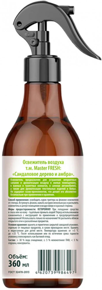 Формула освежителя на водной основе, без спирта и пропеллентов. Отдушки Master fresh — 99% биоразлагаемые, с увеличенной концентрацией парфюмерного масла (15%). Средство эффективно нейтрализует неприятные запахи, безопасно для дома и текстиля — одежды, мебели, занавесок и постельного белья. Не оставляет следов, увлажняет воздух и способствует осаждению пыли, обеспечивая экономичный расход и длительный аромат. Идеален для дома, автомобиля и офиса.