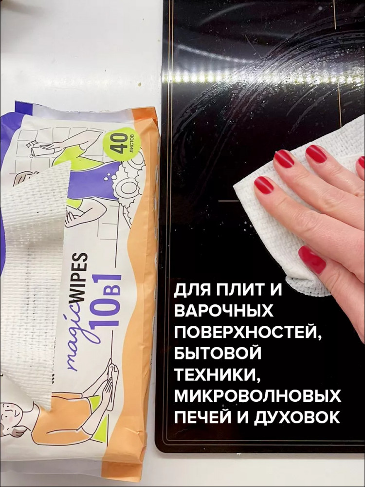 Салфетки с моющим составом для посуды и уборки 10в1 имеют уникальный состав который подходит для мытья посуды, фруктов и овощей, чистки кафеля и плитки, плит и варочных поверхностей, микроволновых печей и духовок, кухонных вытяжек, бытовой техники, раковин и смесителей, кухонных фасадов, детских игрушек. Салфетки для кухни активируются смачиванием, после которого образуется густая пена. Они изготовлены на хлопковой основе и имею особую чистящую фактуру, что позволяет отлично очищать любые поверхности. Моющий состав легко смывается водой или вытирается полотенцем. Пластиковый держатель обеспечит удобство использования салфеток.